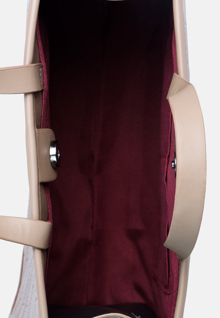 Croc Textured Trapezium-shaped solid structure handbag looks elan and carries all basic stuff. It comes with detachable and adjustable long straps. It has a short sturdy handle. The four pegs at the bottom support your bag and keep it away from scratchy surfaces.