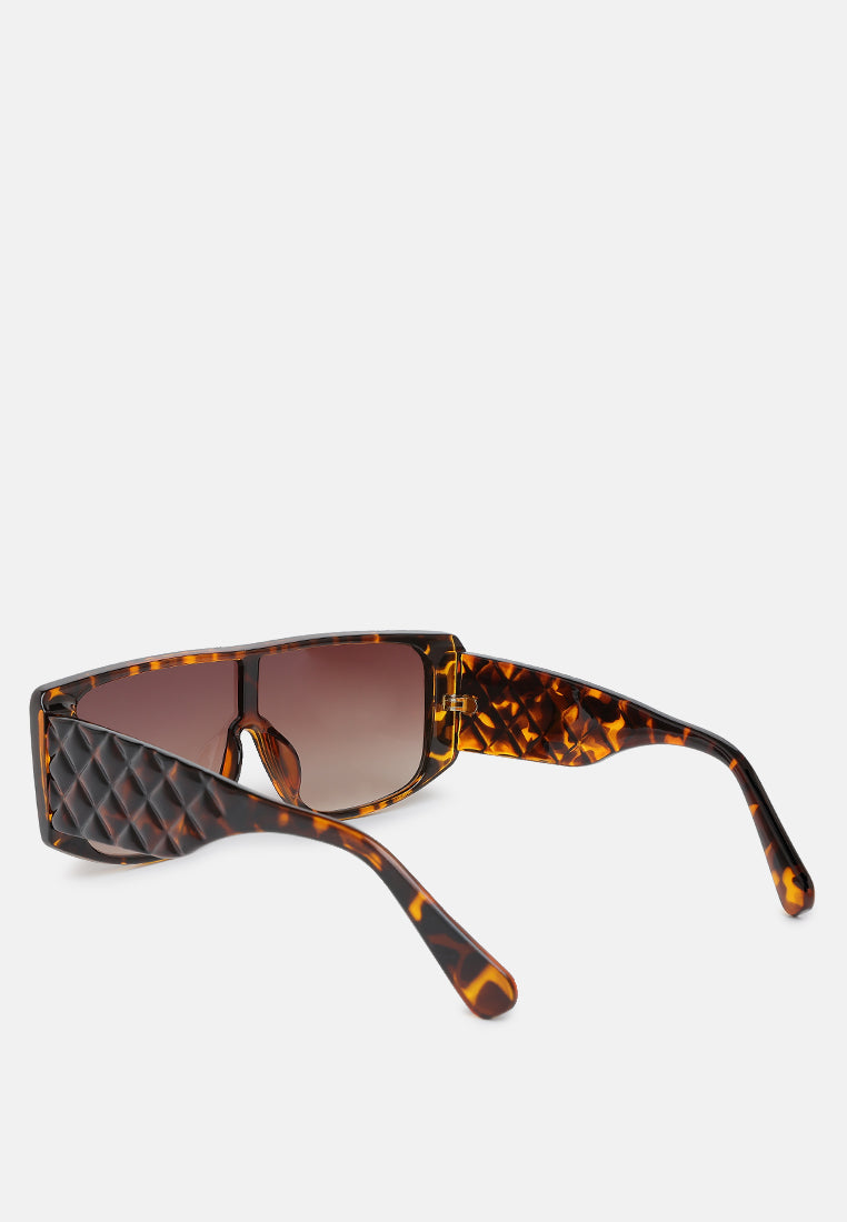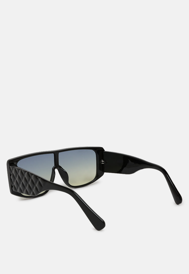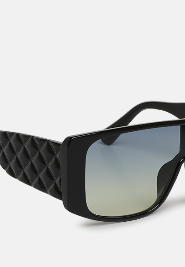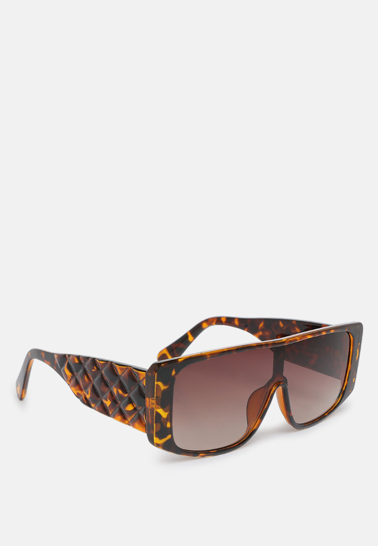 The oversized sunglasses are bold with intriguing cushion textured temples that elevate the overall silhouette of the sunglasses. The polycarbonate material is durable while the tinted lenses have UV protection.