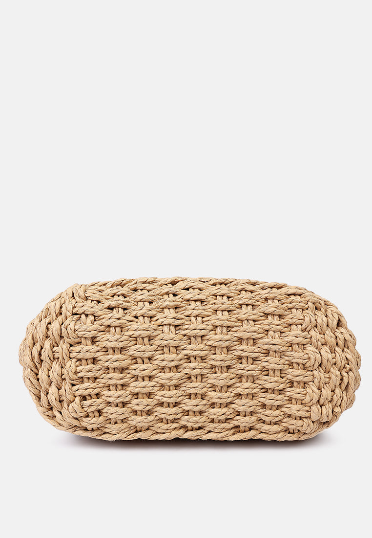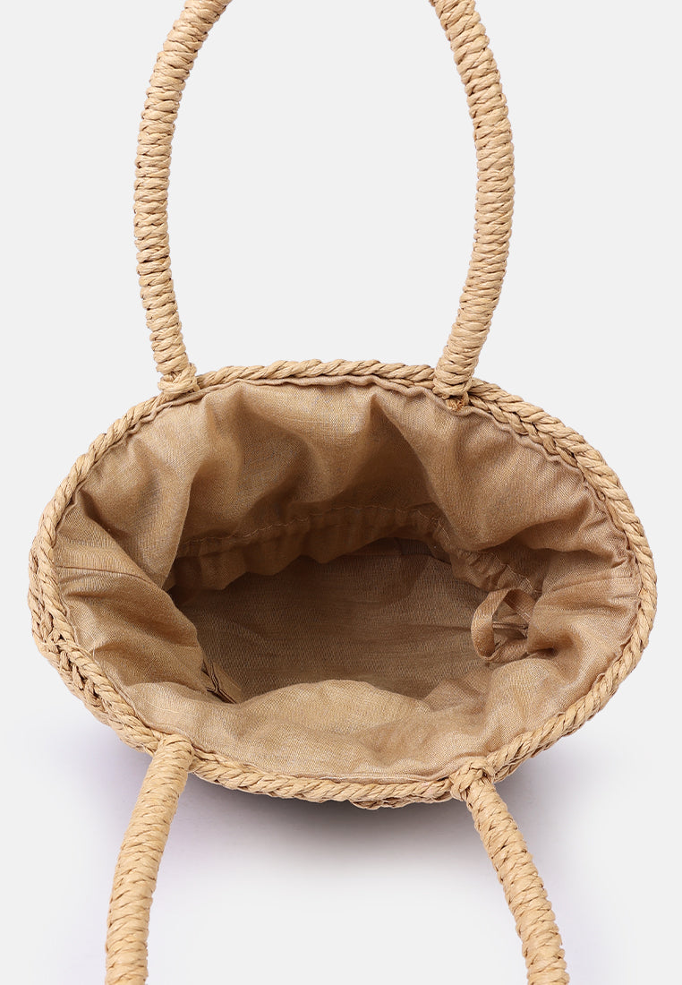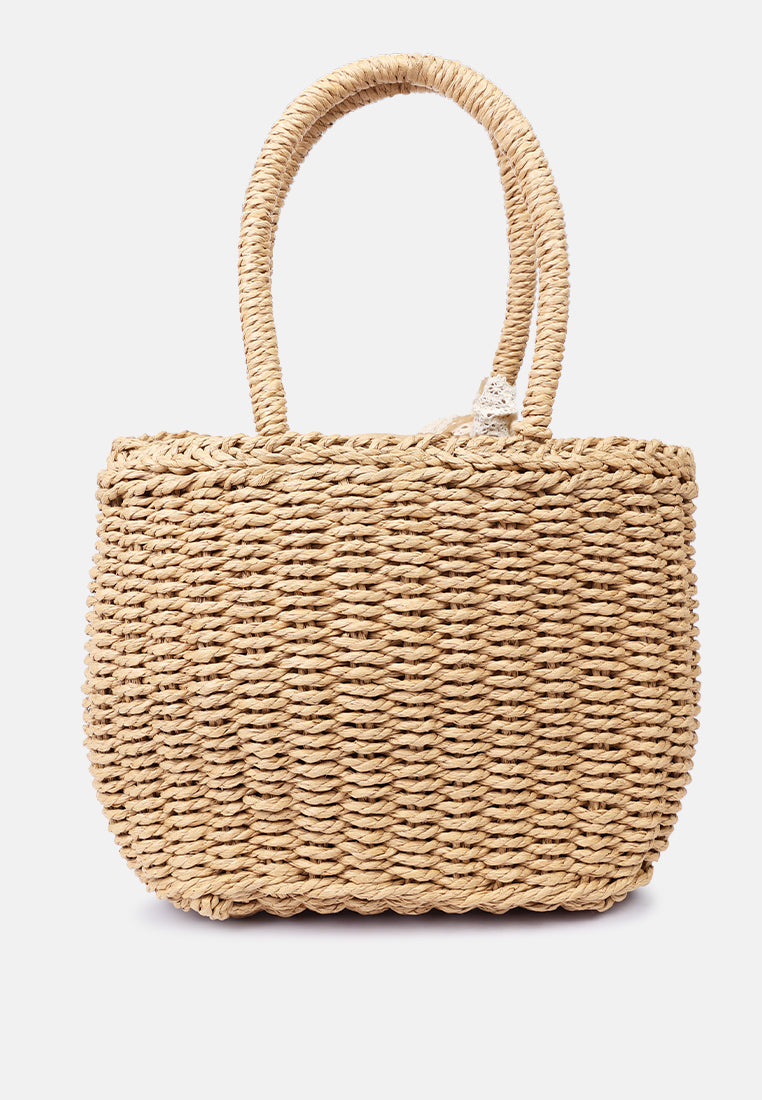 Handwoven paper rope bag with a short handle This bag is made entirely of paper rope and is perfect for the beach or a summer vibe. The delicate lace detail adds frill!