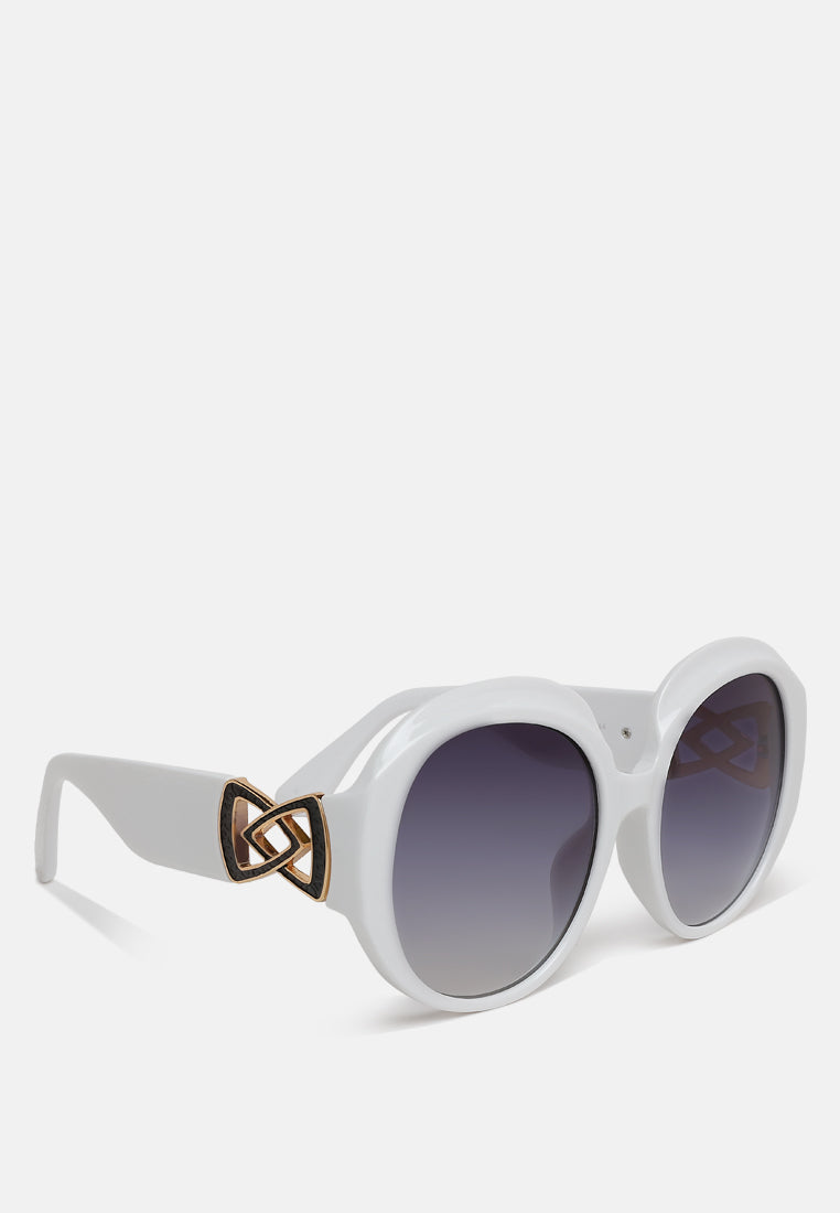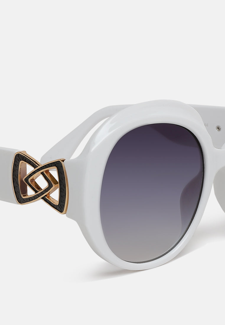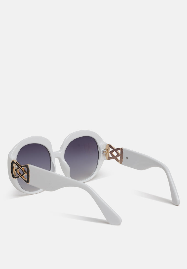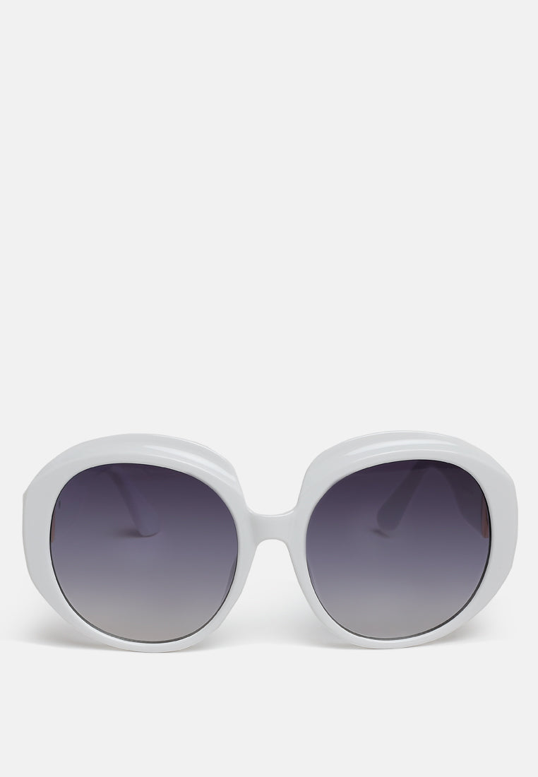 The sunglasses have a retro flair with the metallic accent near the hinges, while the oversized round lenses give off a dramatic effect. The sunglasses are made with durable polycarbonate making them a sturdy and stylish pair.