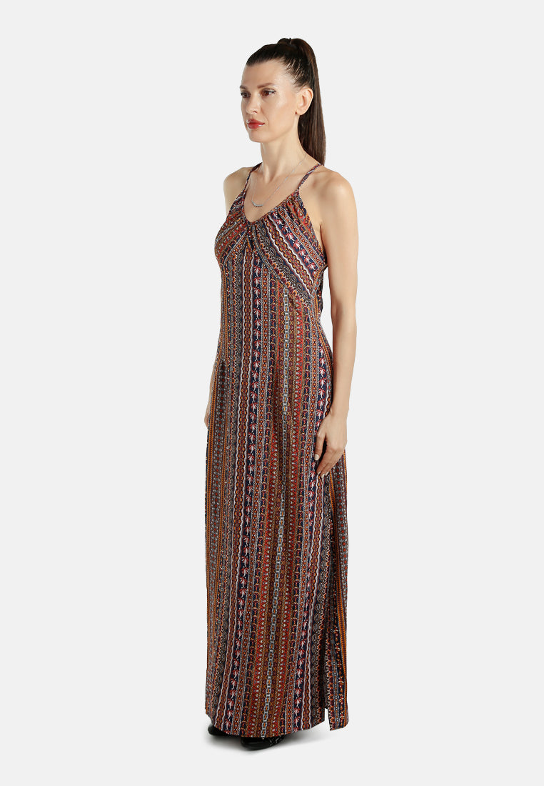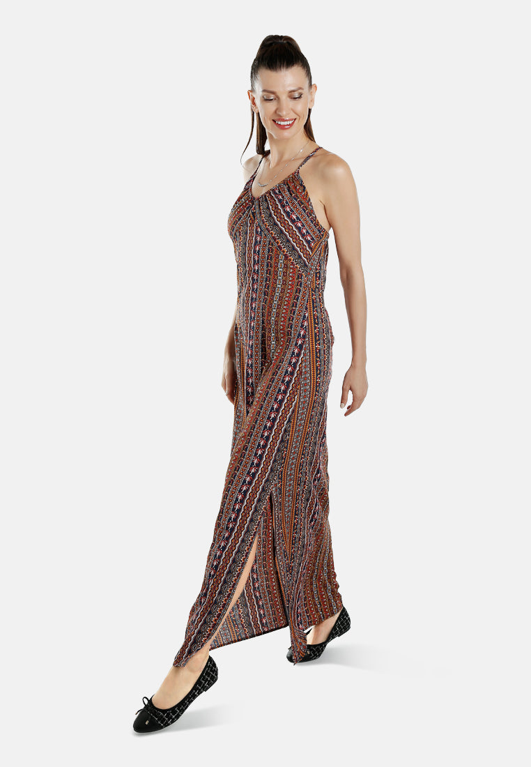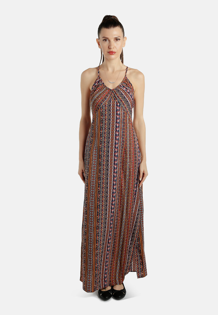 This maxi dress features an intricate all-over print and delicate thin straps that form a chic crisscross back. The flowy silhouette offers a relaxed yet elegant look, with a side slit that adds just the right amount of edge to show off your stiletto heels or calf-length boots.