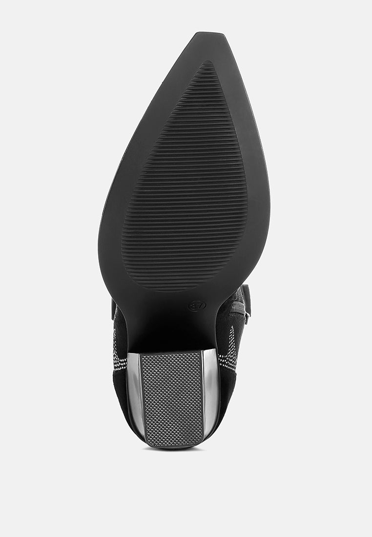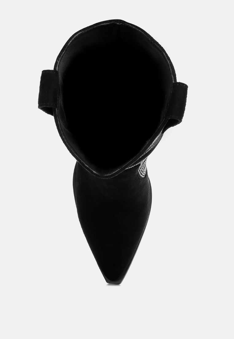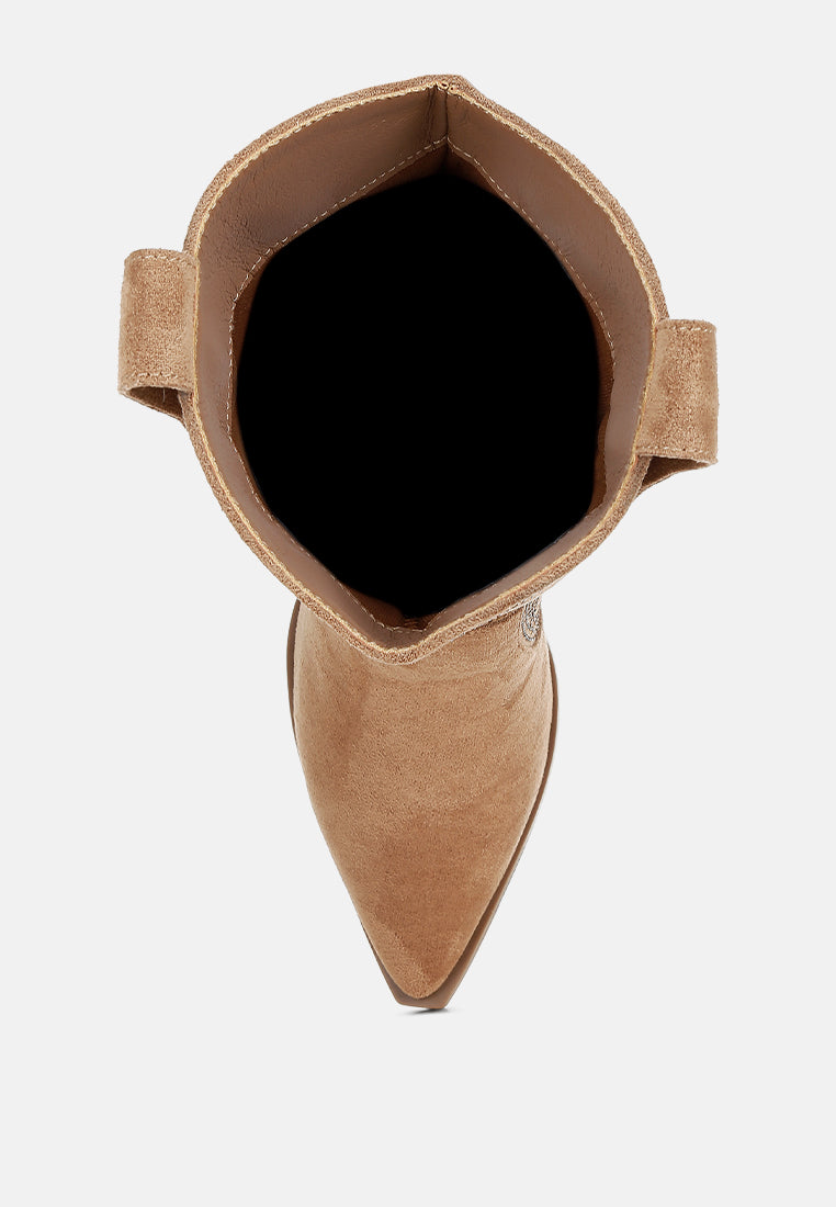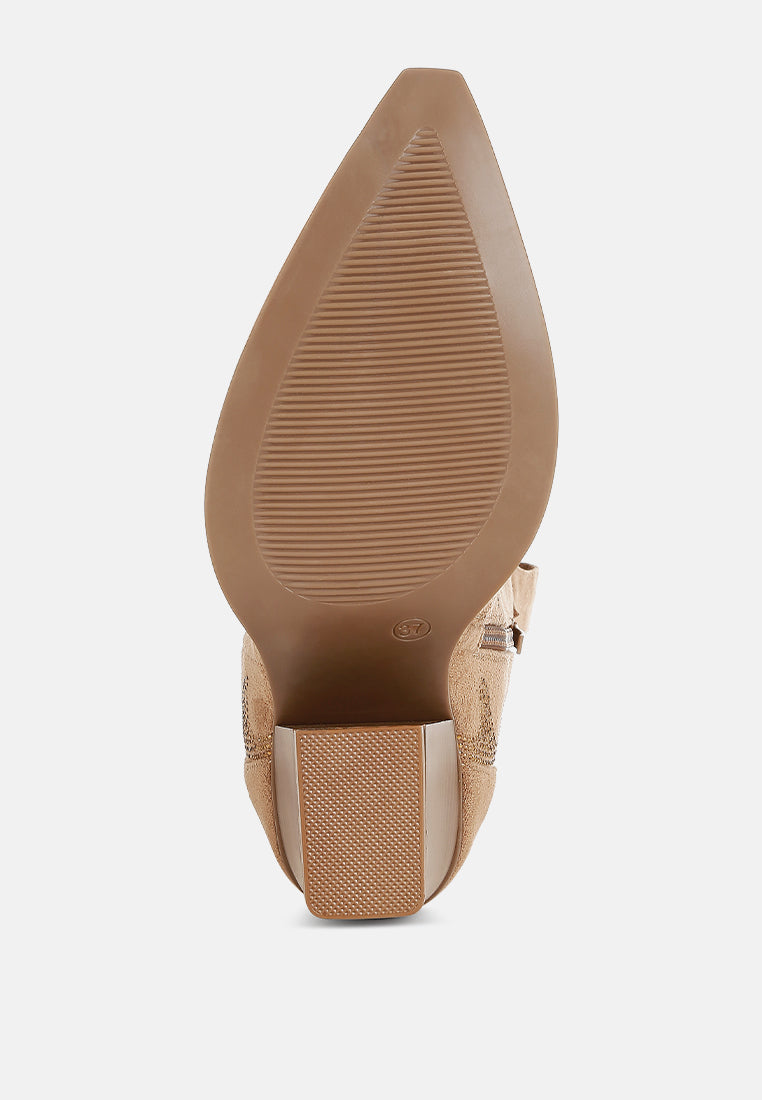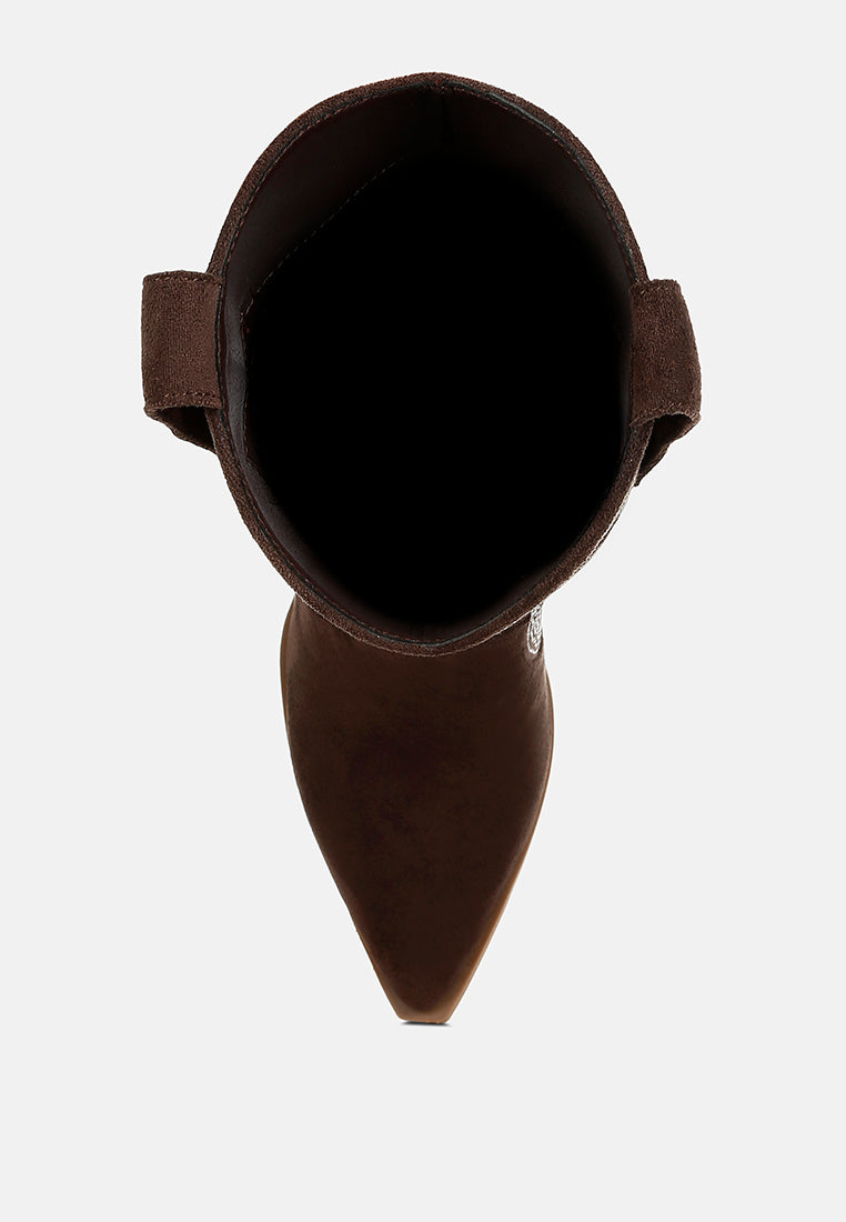 The rhinestones embellished calf boots have an elegant charm with the patterned rhinestone embellishments which give a dazzling effect to the design. The cowboy boots have that West flair, giving the aesthetic an edge and making a distinctive statement. The pull tabs are convenient and make for an easy to wear experience.