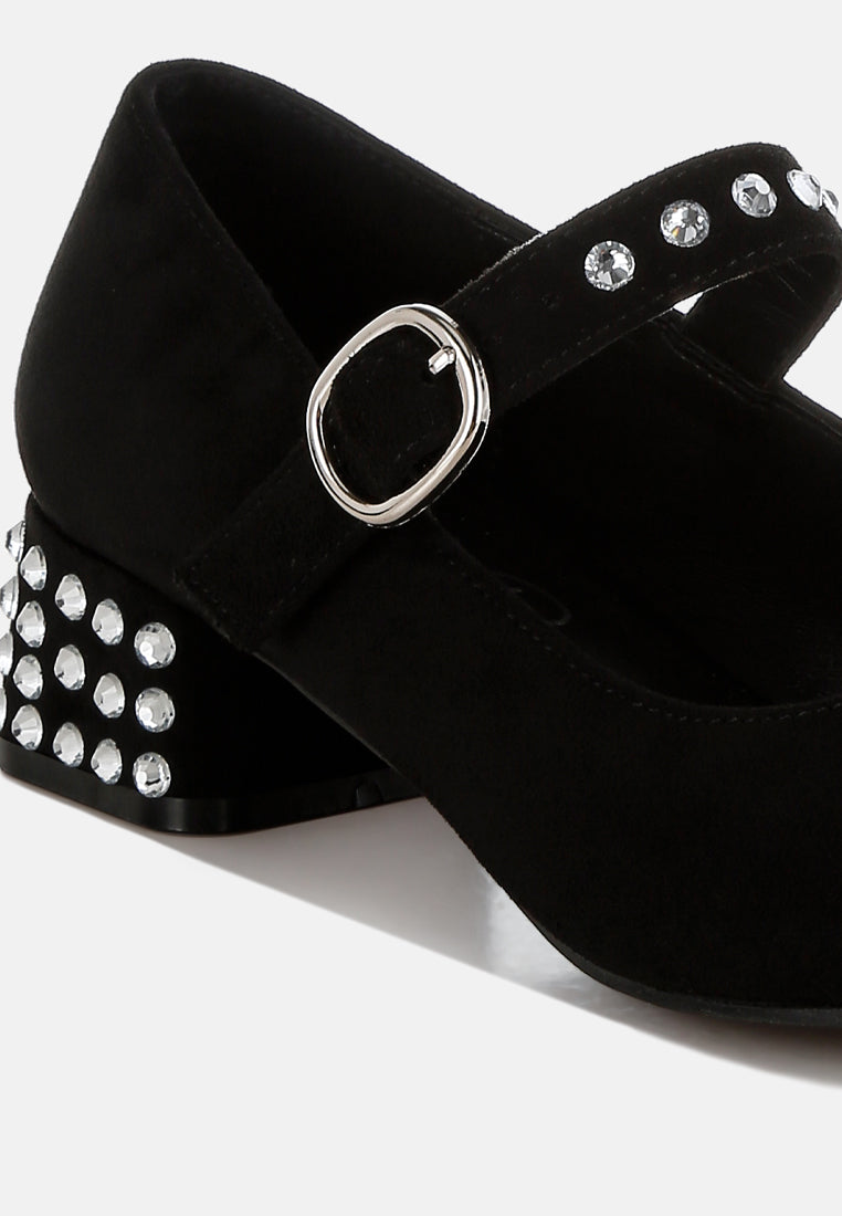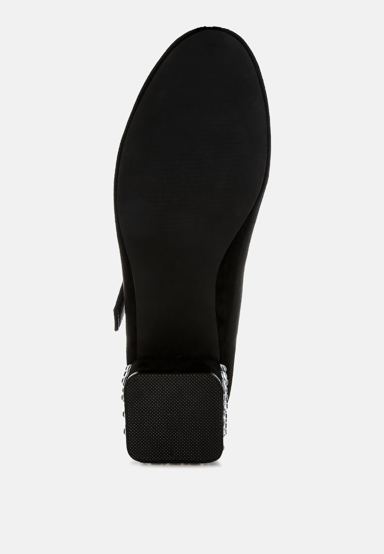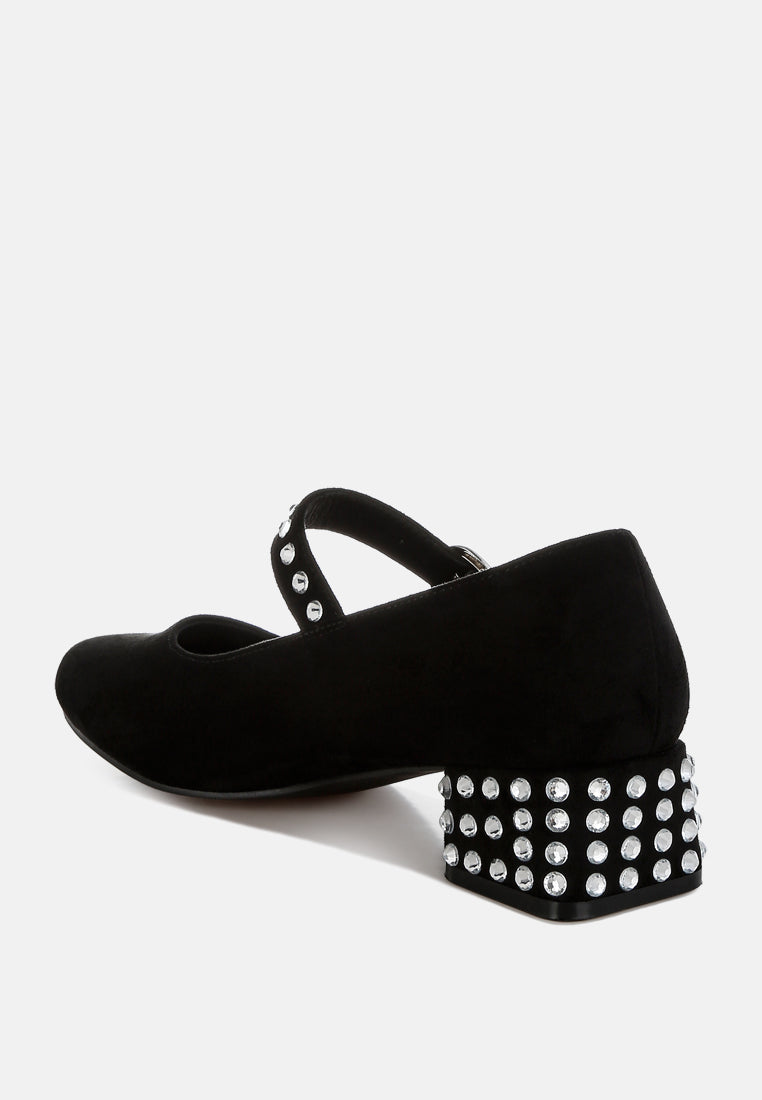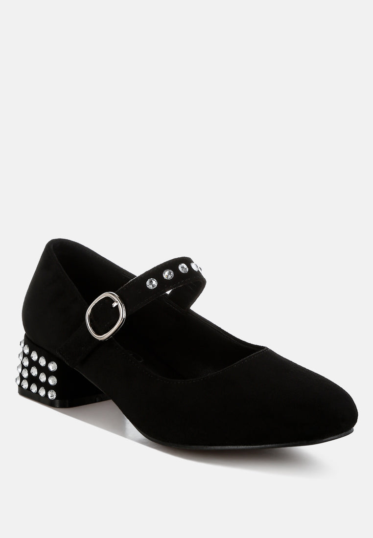 Step into luxury with these microfiber Mary Jane pumps featuring a classic round toe. Designed with a 1.5-inch low block heel and a midfoot pin buckle strap, these studded pumps ensure comfort with their plush cushioned insoles. Perfectly paired with tailored trousers or mini skirts.