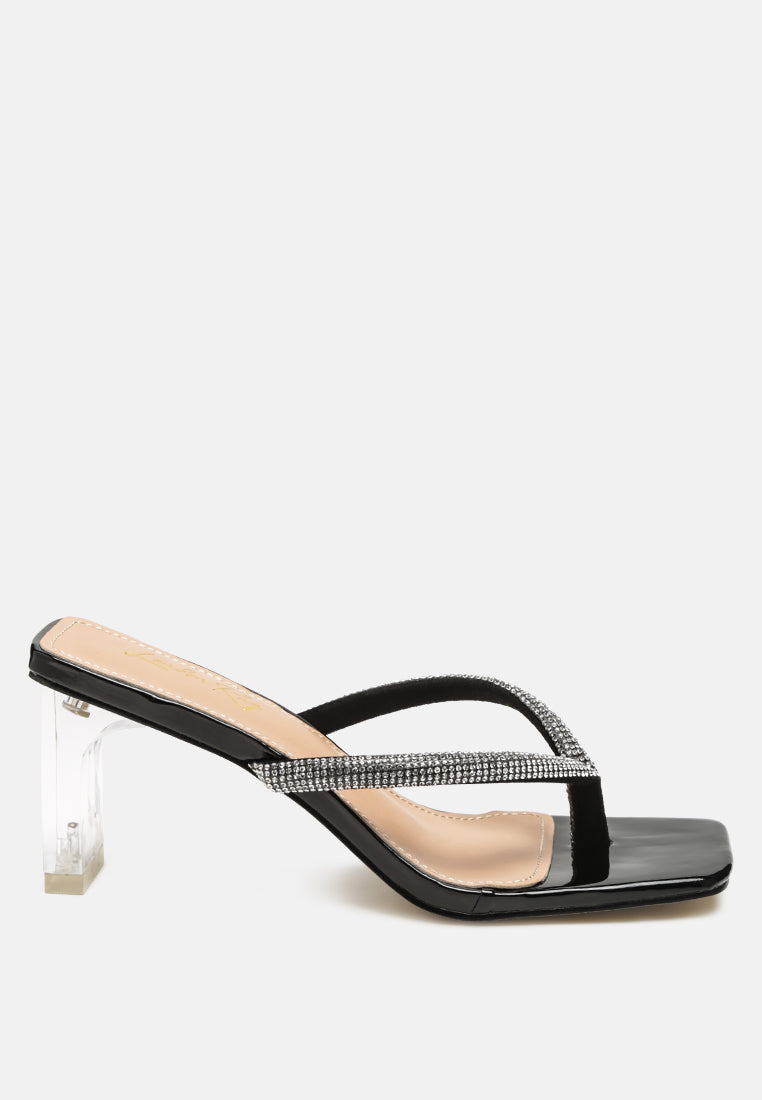 Crystal lined thong high-heeled sandal. The clear block-heeled square toe sandal has cushioned insole to keep feet in some comfort. Comes in delightful color options to choose from.