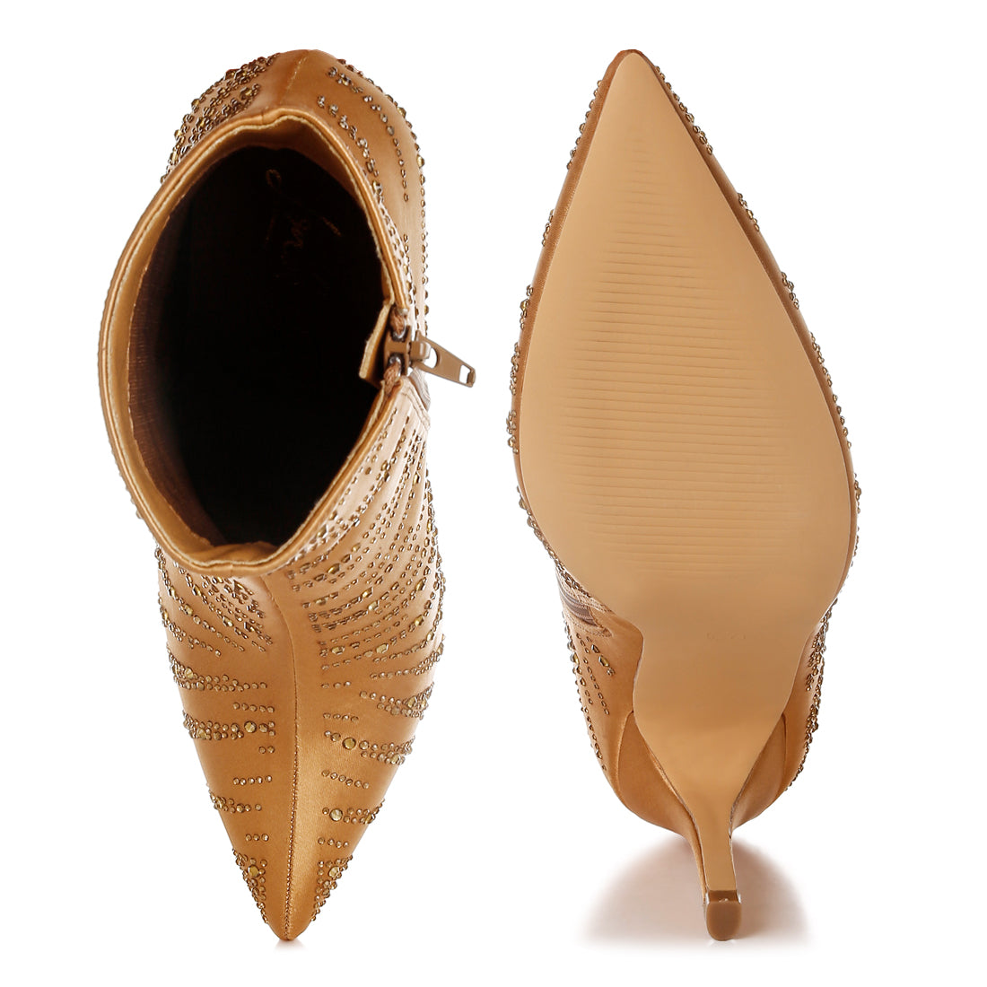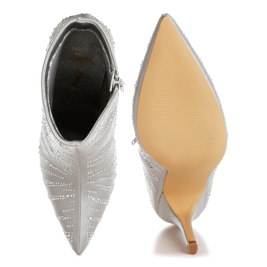 Refresh your wardrobe with these satin ankle boots, complete with a pointed toe, sleek stiletto heel, and dazzling rhinestones. Ideal for parties, weddings, or date nights, these boots add the perfect amount of sparkle and elegance to any special outfit.