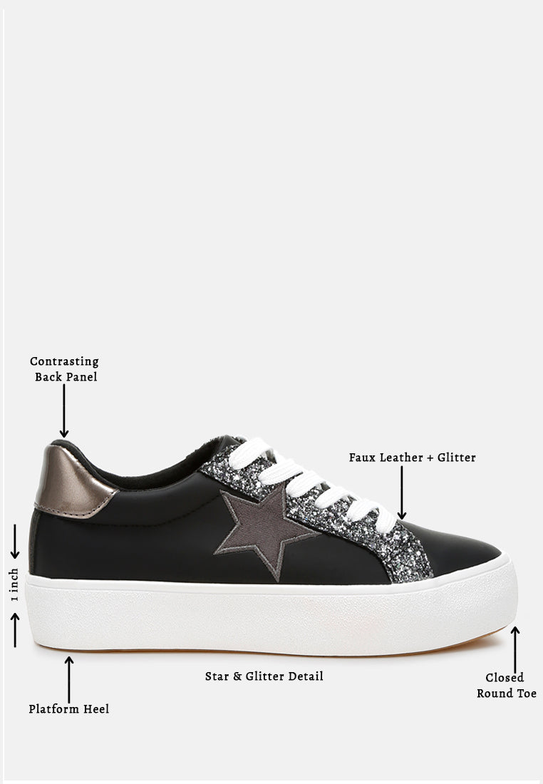 Elevate your sneaker game with these chunky star sneakers with a glitter patch vamp and a metallic counter, giving the sneakers an eclectic unique look. The sneakers give a secure and comfortable fit with the lace up design and comfortable cushion insole.