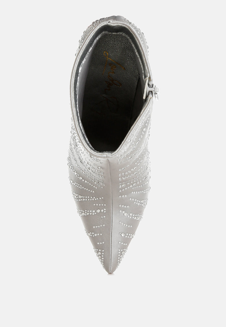 Refresh your wardrobe with these satin ankle boots, complete with a pointed toe, sleek stiletto heel, and dazzling rhinestones. Ideal for parties, weddings, or date nights, these boots add the perfect amount of sparkle and elegance to any special outfit.