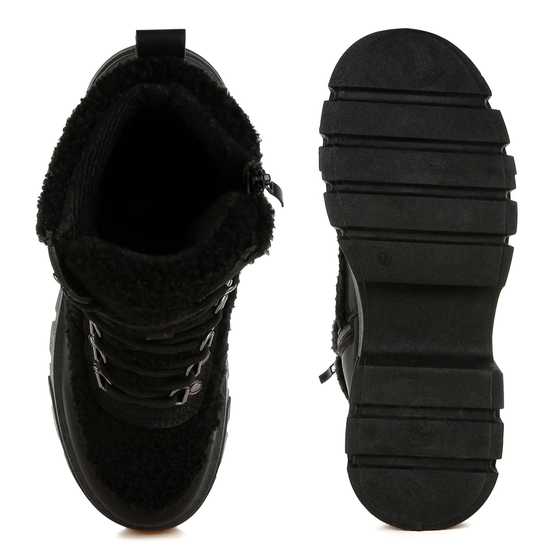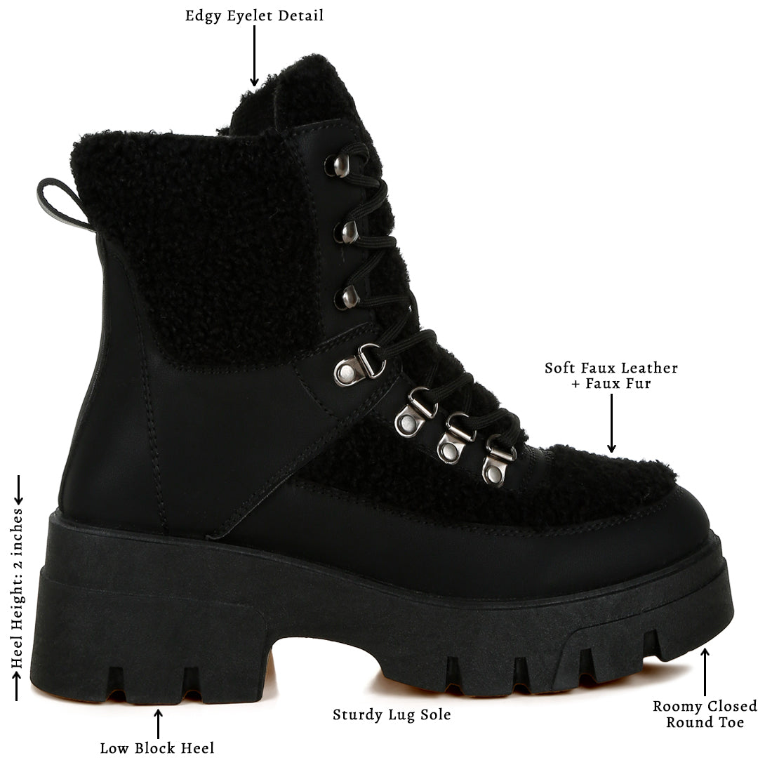 These rugged, chunky faux leather hiker boots are built for durability and style. They feature a solid construction, an anti-skid lug sole for great traction, and a cosy faux fur detail. With a classic lace-up design, a functional side zipper and handy pull tabs, these boots are both comfortable and ready for any adventure.