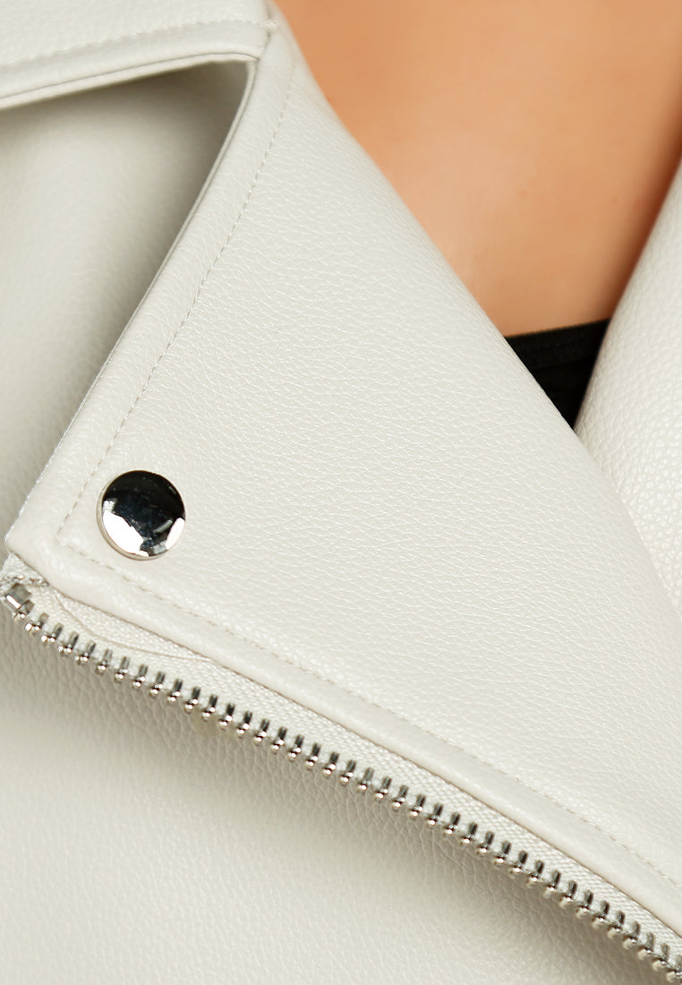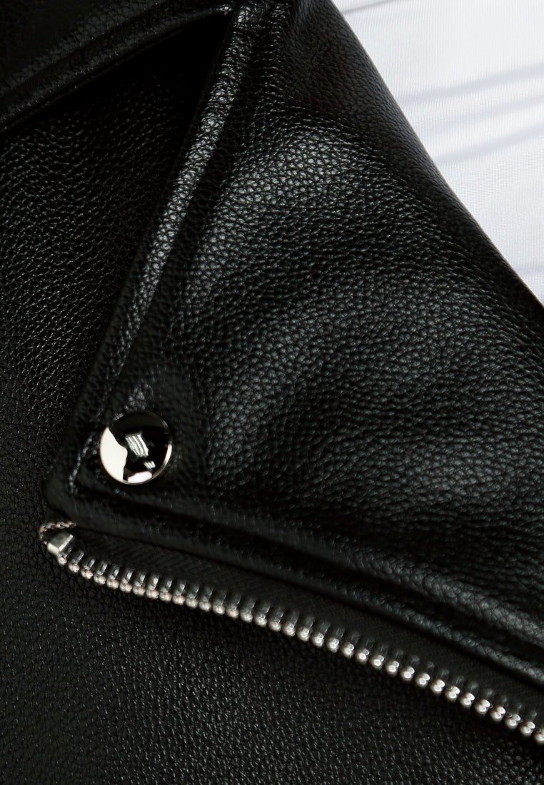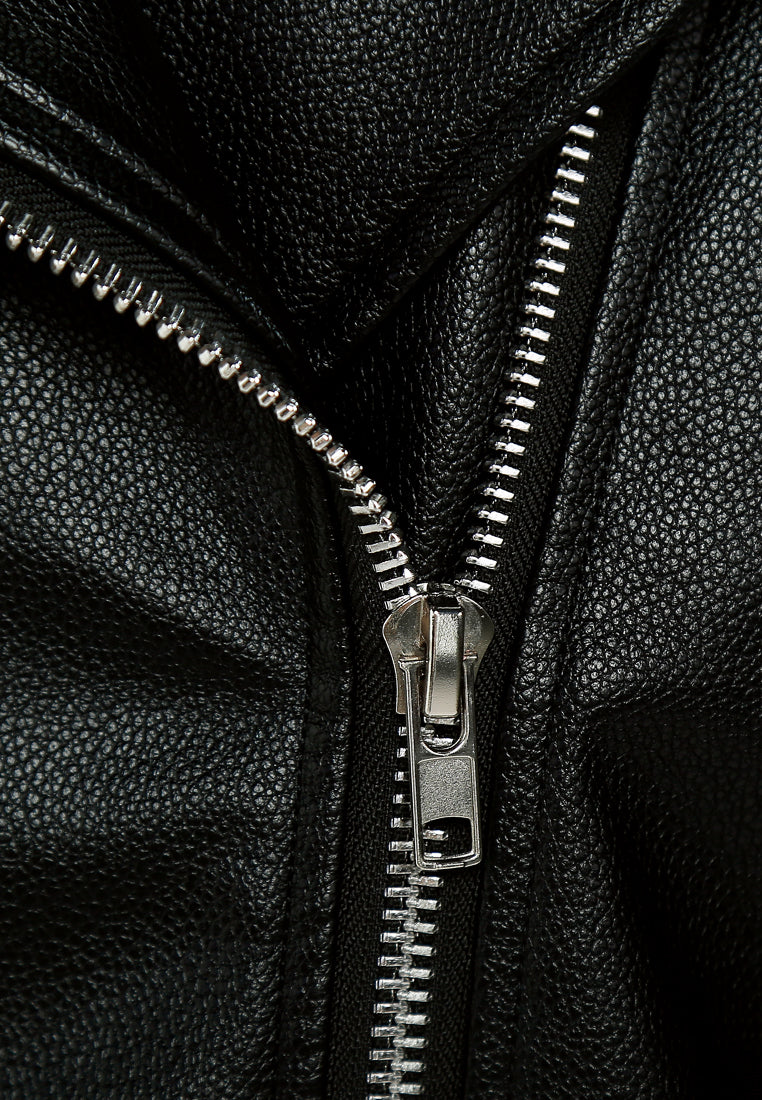 Introducing our classic biker jacket, tailored for an oversized fit and designed with timeless details. Featuring a lapel collar and full sleeves, this jacket exudes effortless cool. Complete with a belt detail and button accents for added flair. Comfortable lining and a stylish design, this jacket is a must-have in your wardrobe!