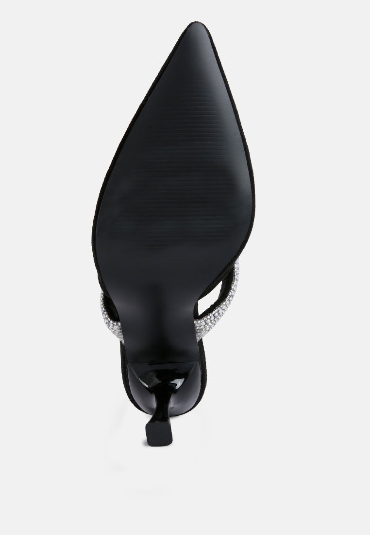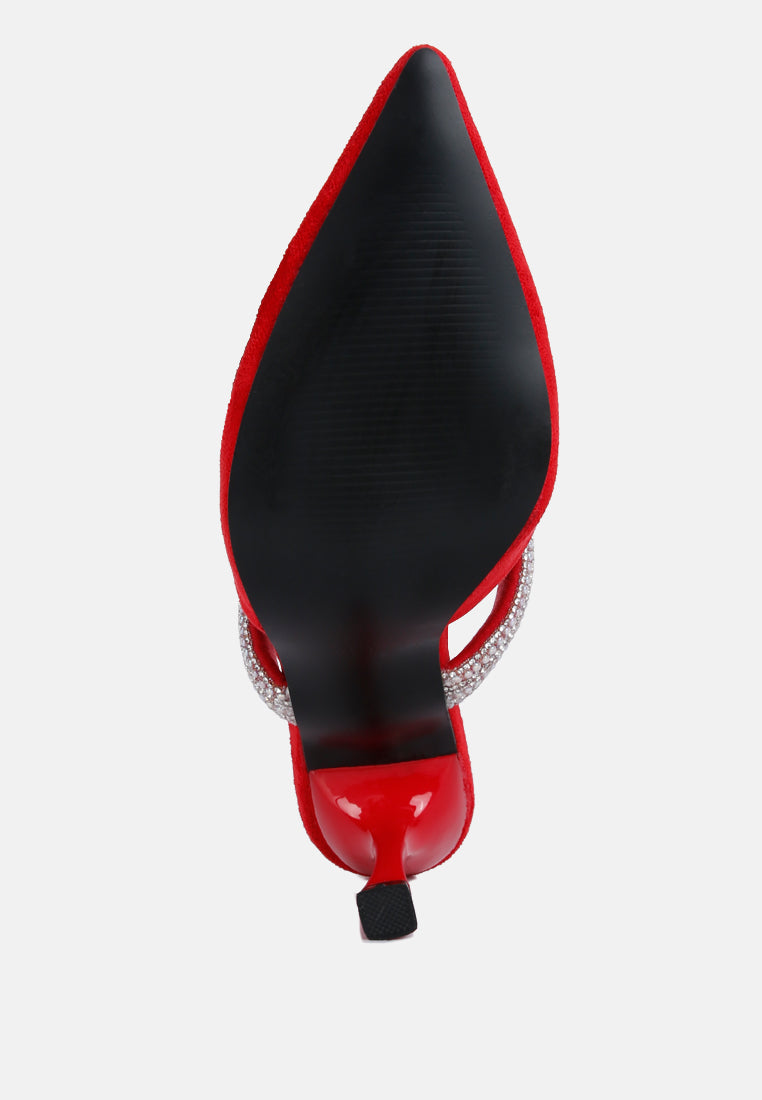 The diamante detail strap amps up the whole look, the pointed toe construction gives the sandals a sharp look. The pair is a a show stopper, indeed! The short heel and soft innersole makes the slip on sandals easy to wear.