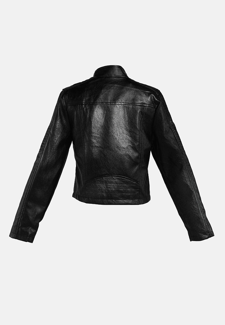 Collar faux leather Biker Jacket with quilt detail full sleeves. Stylish, edgy, and sturdy women's PU jacket with a shirt collar, zipped pockets with metal zipper, falls above the hip. With multiple seam construction this one fits well along the torso and gives the perfect edgy look with quilted patch on the arms.