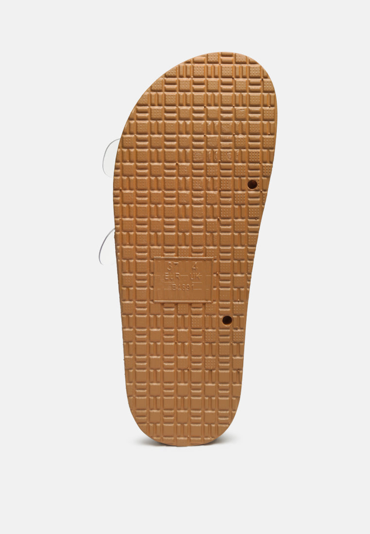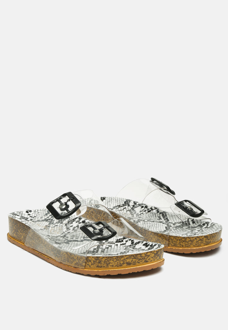 Transparent Slides with big buckled straps. Is raised on cork platform, offers great grip on all surface. A trendy pair of casual flats.