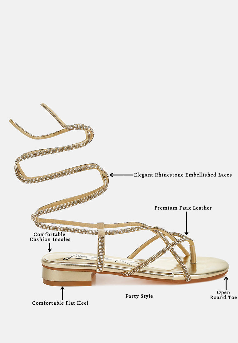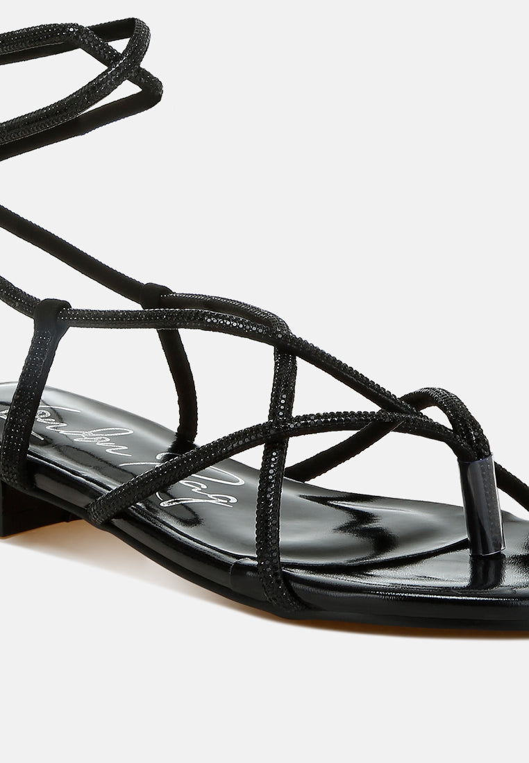 Obsessed with these rhinestone-embellished lace-up sandals! Crafted with a faux leather upper, these flat-heeled sandals feature a chic open round toe for added comfort. Perfect for parties, dates, or weddings, these lace-ups come with plush cushioned insoles, making them a timeless pair to own.