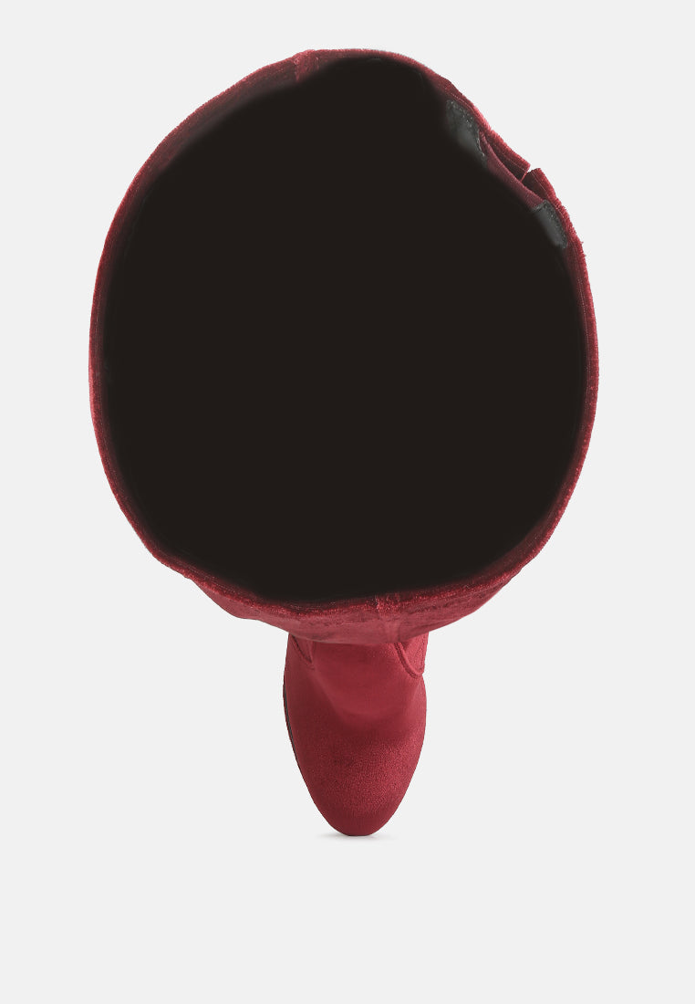Keeps you winter ready with dose of oomph: the stiletto heeled long boot further accentuated by high platform is a killer fall boot made with cut pile velvet as outer. It has side zipper which makes it easy to wear. Comes with harness bands on the ankle which have metallic pin buckle details.