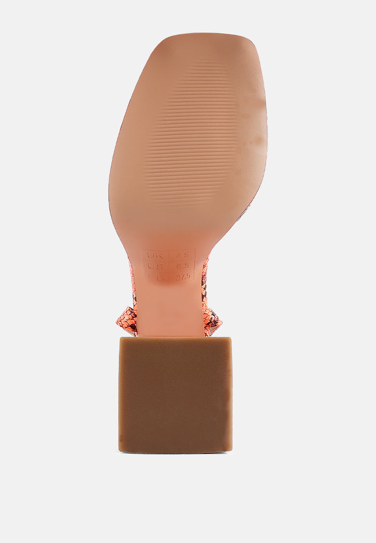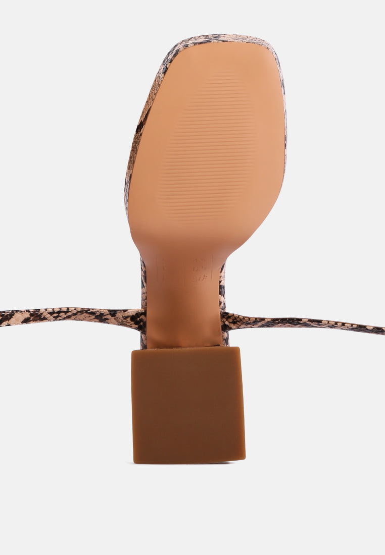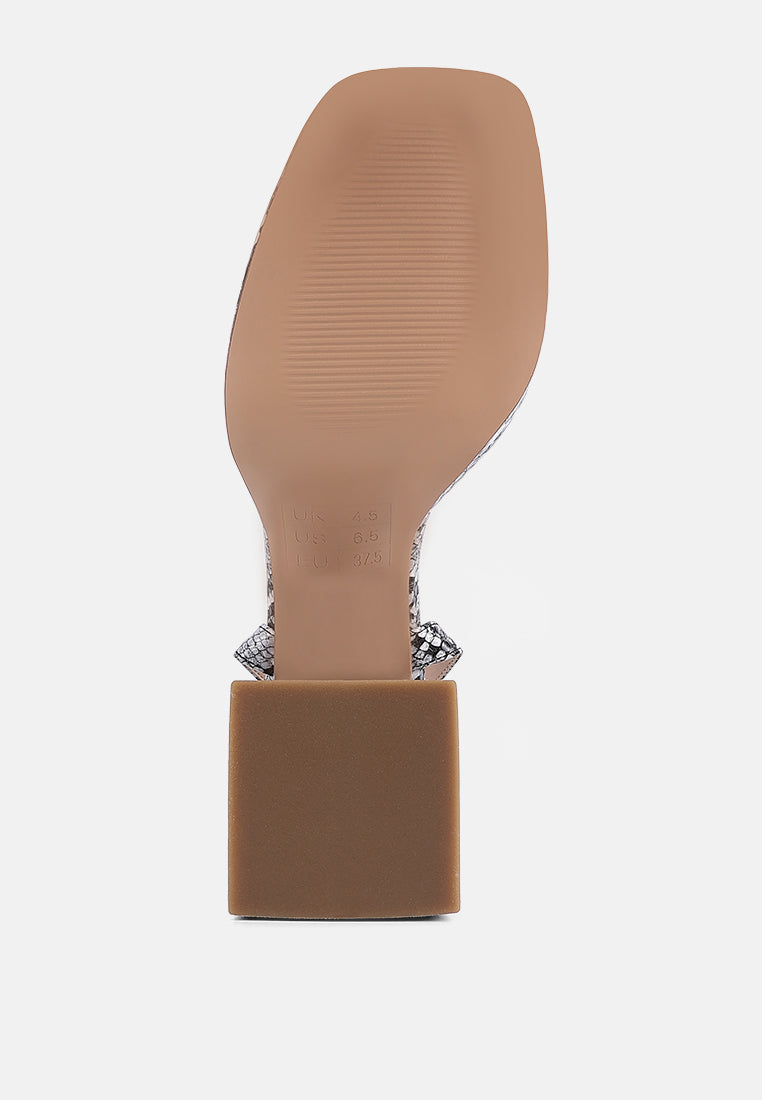 Simple silhouette filled with engaging snake skin print. It has clear front strap and toe ring which holds feet well. The ankle band with pin buckle fastening secures feet. The chunky block heel is a trendy style; a must have statement style this season.