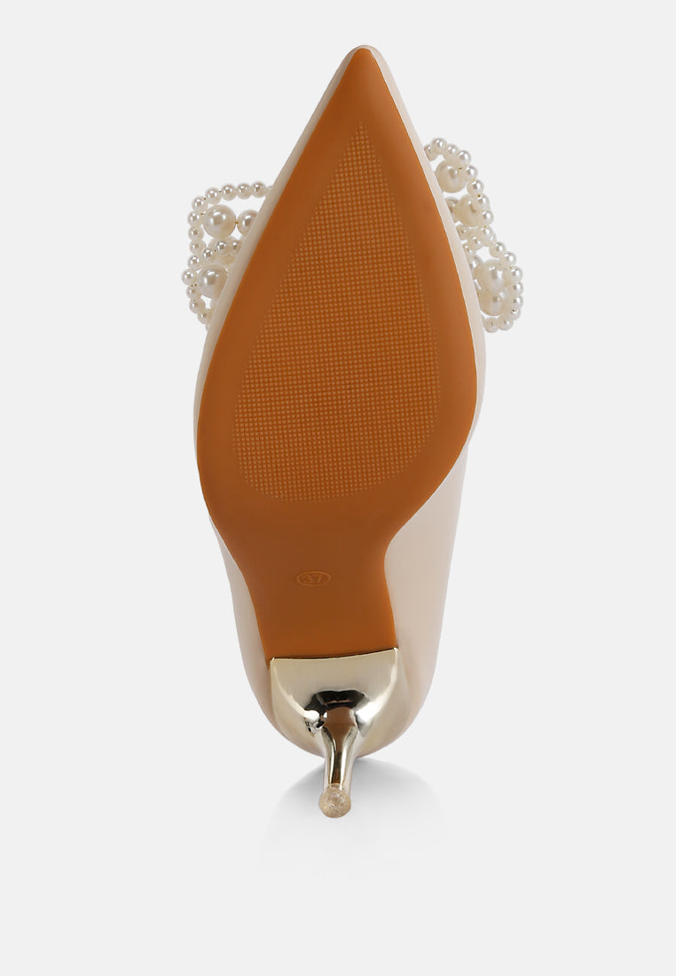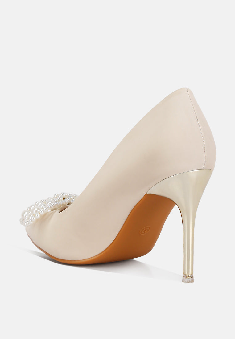 Party wears a high-heeled casual stiletto sandal with metal shiny heels and faux pearls flowers on top. Has cushioned insole which absorbs great strain.