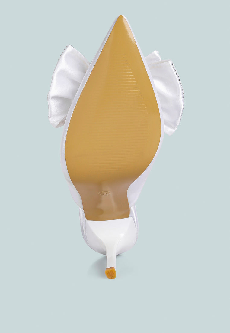 High Heeled Luxe Mules handcrafted in Satin and made for casual evenings and after hours. The elegant dress sandals have diamante studded bow on top - these high heeled stilettos have lightly padded insole which cuts strain.