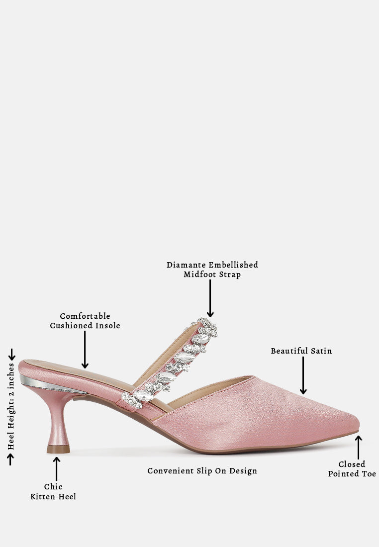 Elegant, chic, and comfortable, the satin mules are dazzling with the beautiful diamante embellished midfoot strap. The satin upper gives a graceful look while the soft cushion insoles are comfortable, and the slip on design is convenient.