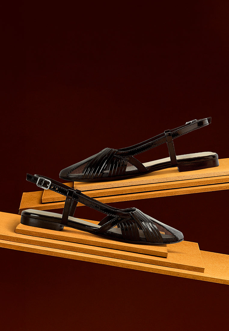 The slingback sandals have a chic flair with the mesh and contrasting patent faux leather upper. The pin buckle fastening ensures a snug and secure fit while the soft cushion insoles cut strain. The flat sandals are the perfect amalgamation of comfort and style.