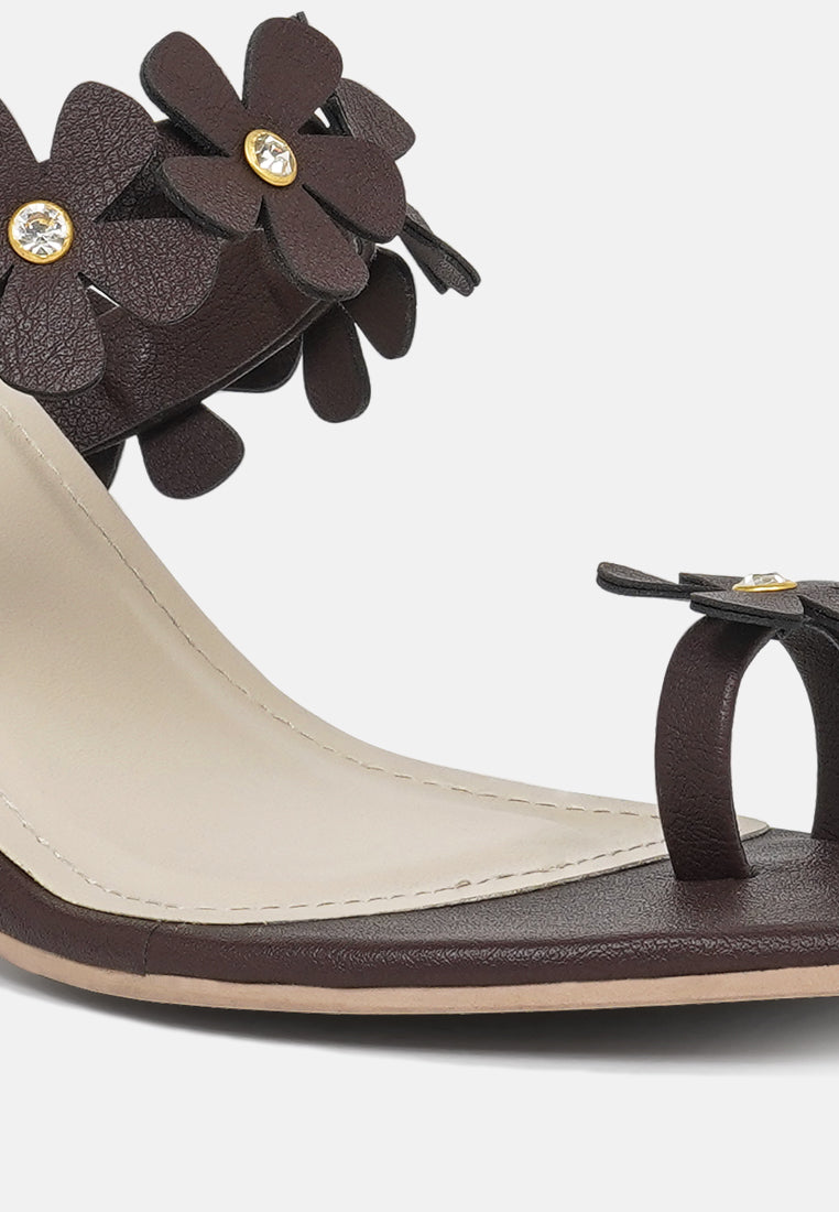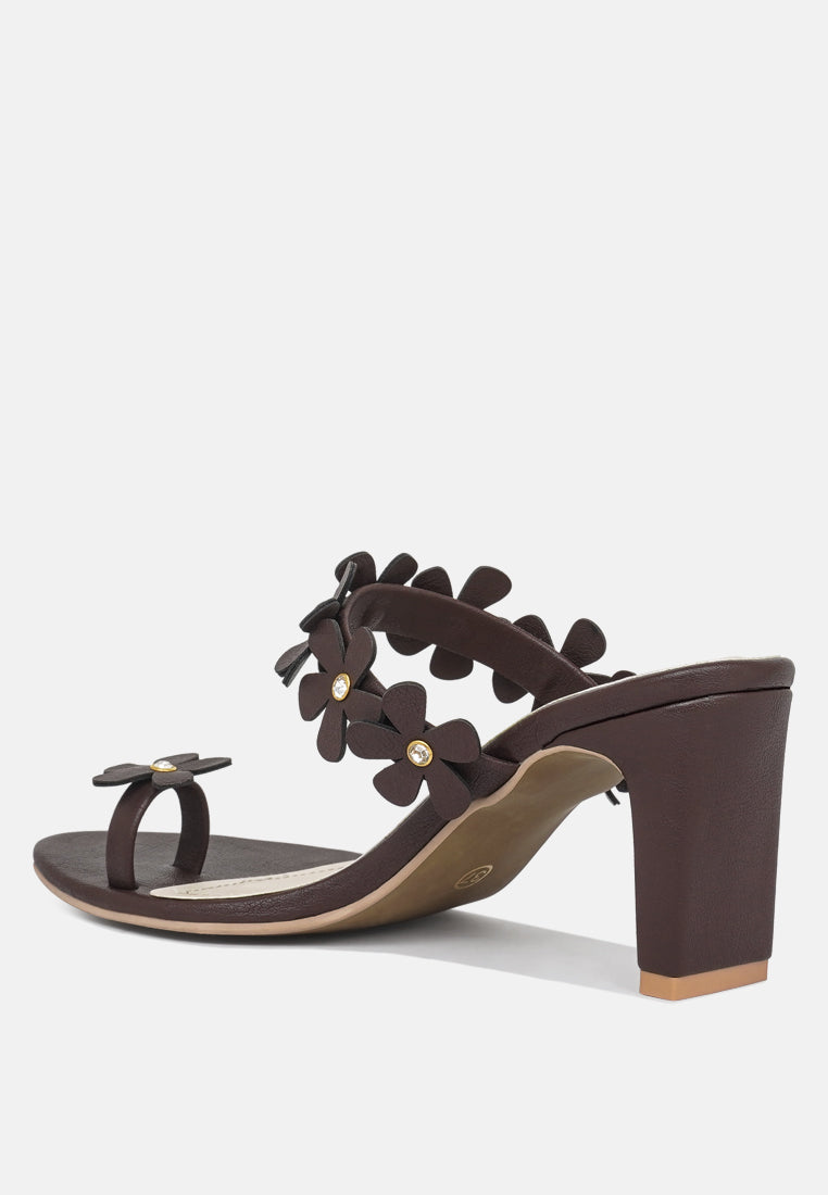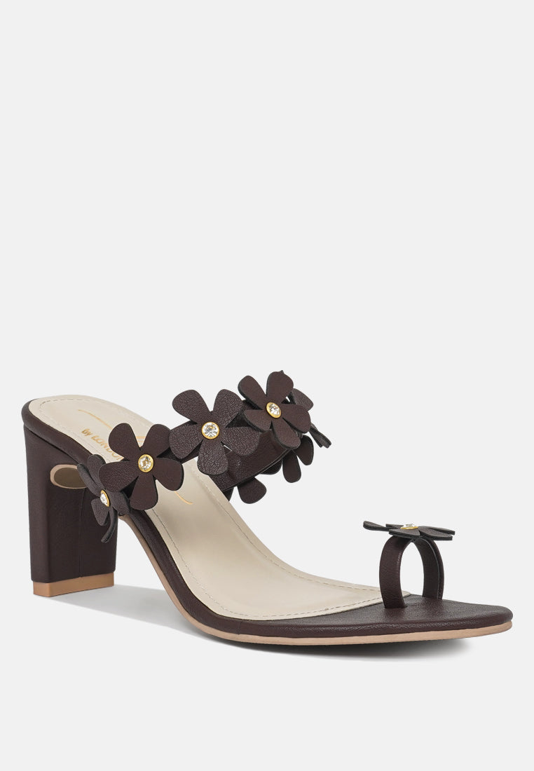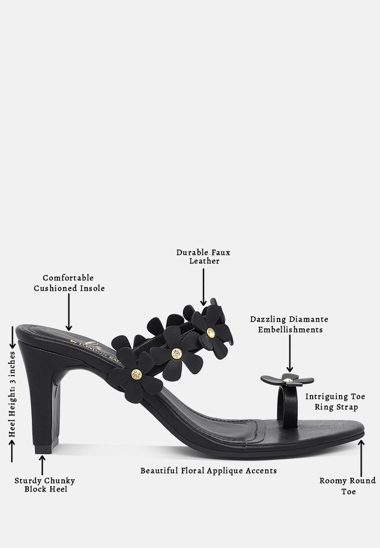 A mix of comfort and character, these sleek block heels come with a playful toe-ring strap topped with floral accents. The soft cushioned insole keeps them wearable, while the diamante details give just the right pop. Dress them up or down—a stunning pair you'd never regret slipping on.