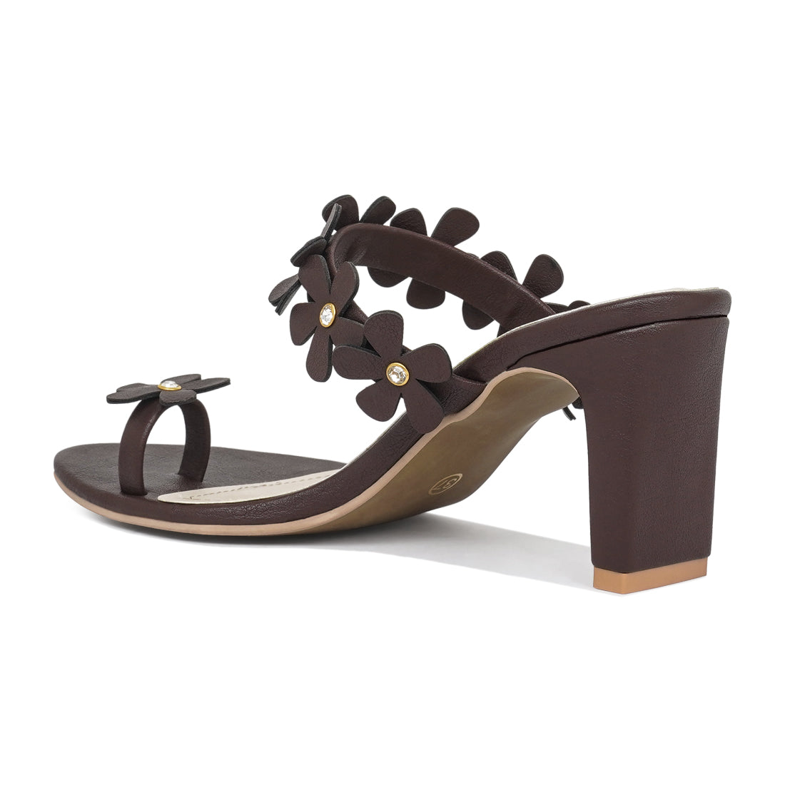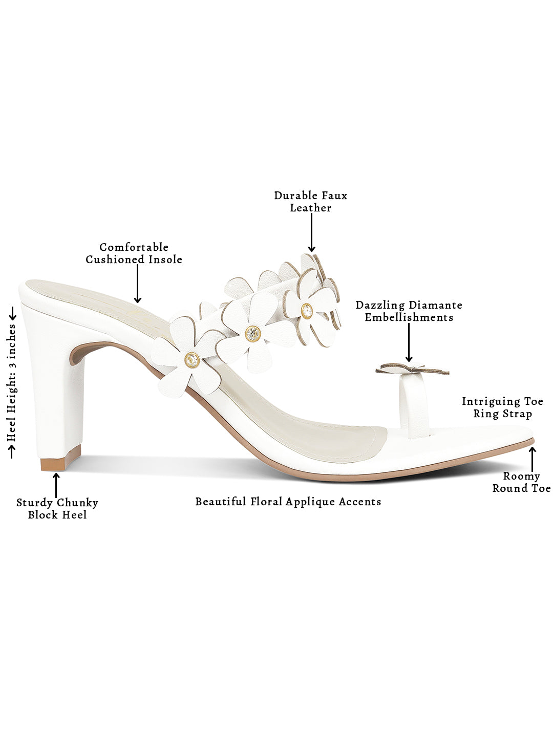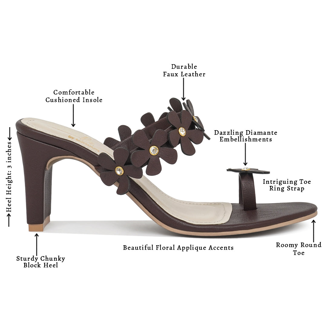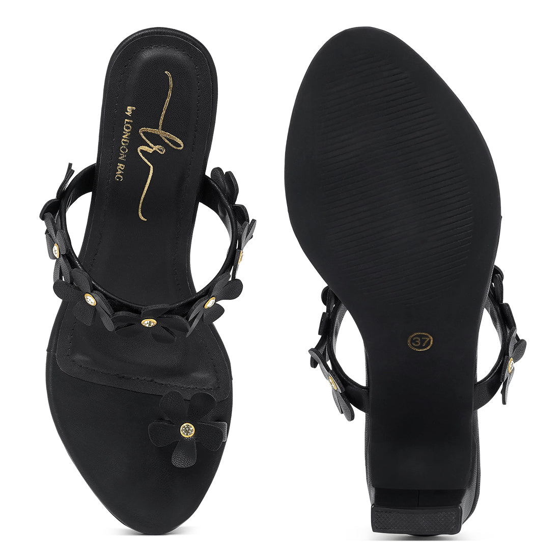A mix of comfort and character, these sleek block heels come with a playful toe-ring strap topped with floral accents. The soft cushioned insole keeps them wearable, while the diamante details give just the right pop. Dress them up or down—a stunning pair you'd never regret slipping on.