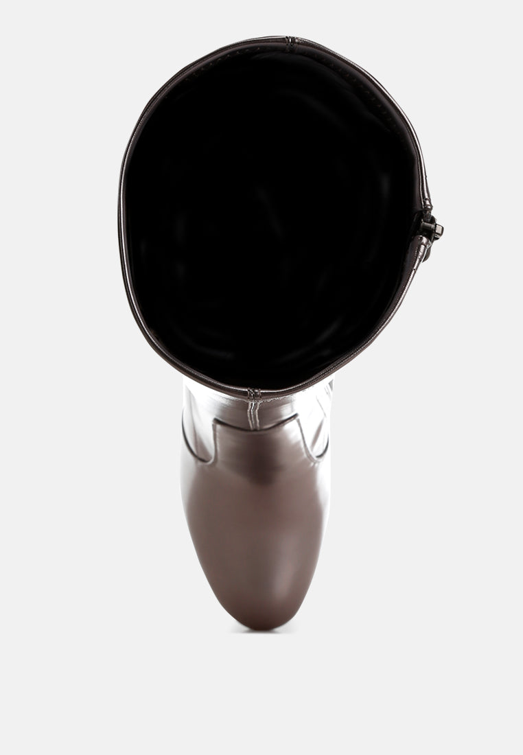 The metallic long boots are ravishing with the shiny exterior, block heels, and paneling detail. The boots would pair beautifully with some sequin dresses or faux leather ensembles for a bold and alluring look.