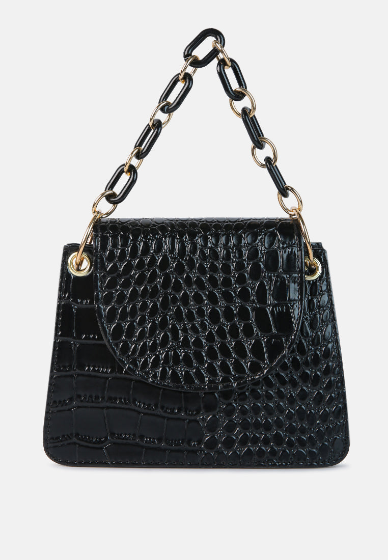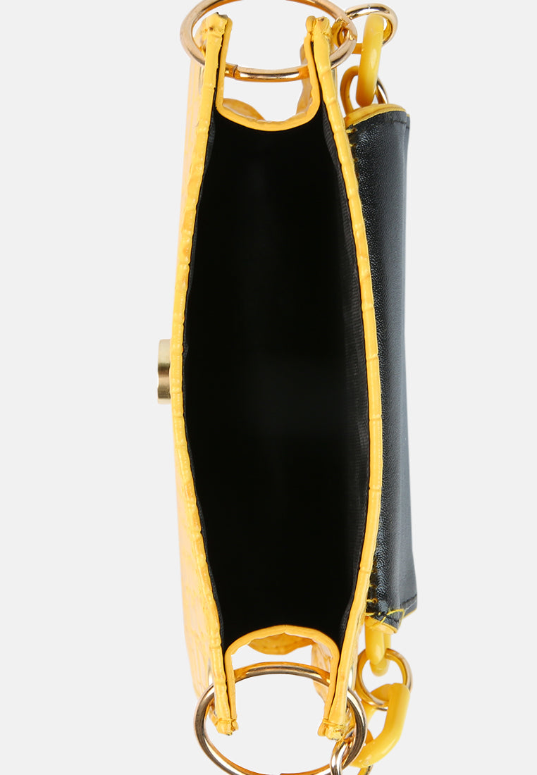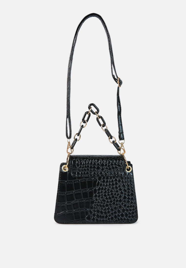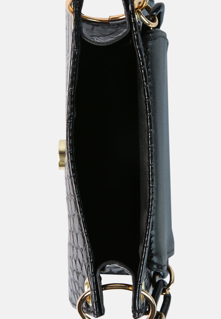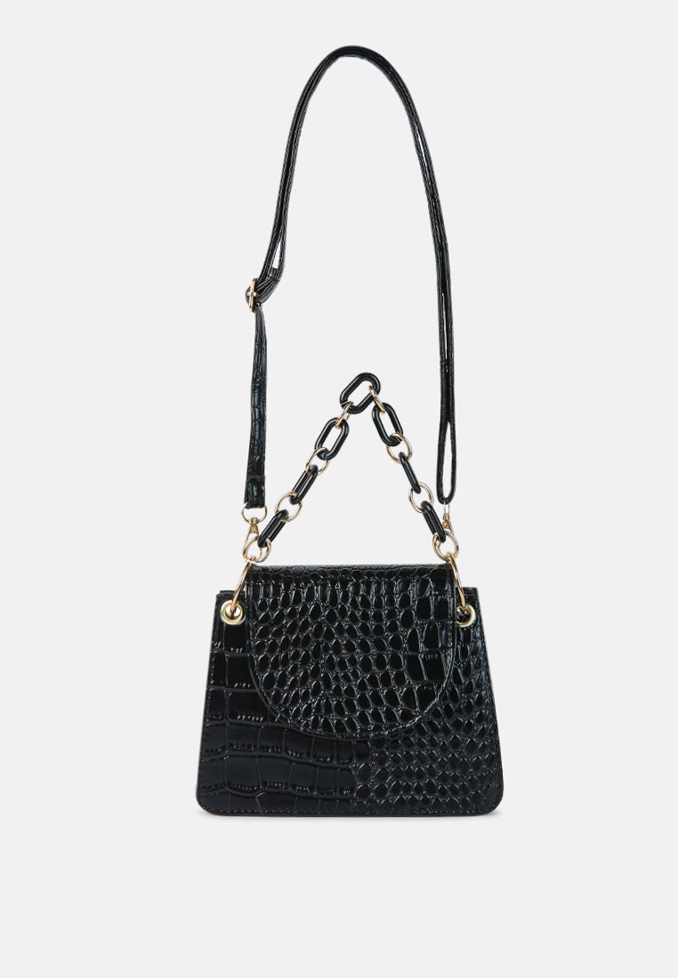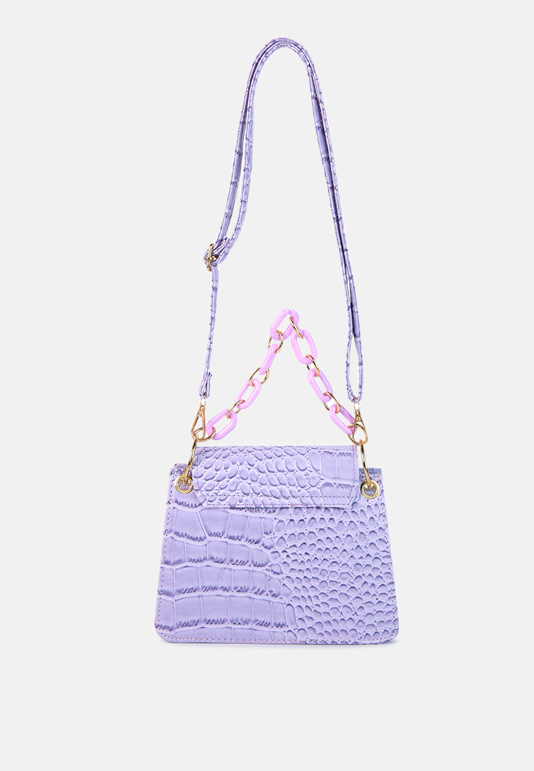 With Round Flap, this Envelope Sling Bag has an interesting Croc Textured Body and comes with a long detachable strap along with a stylish metal chain handle. It has a metallic button fastening.