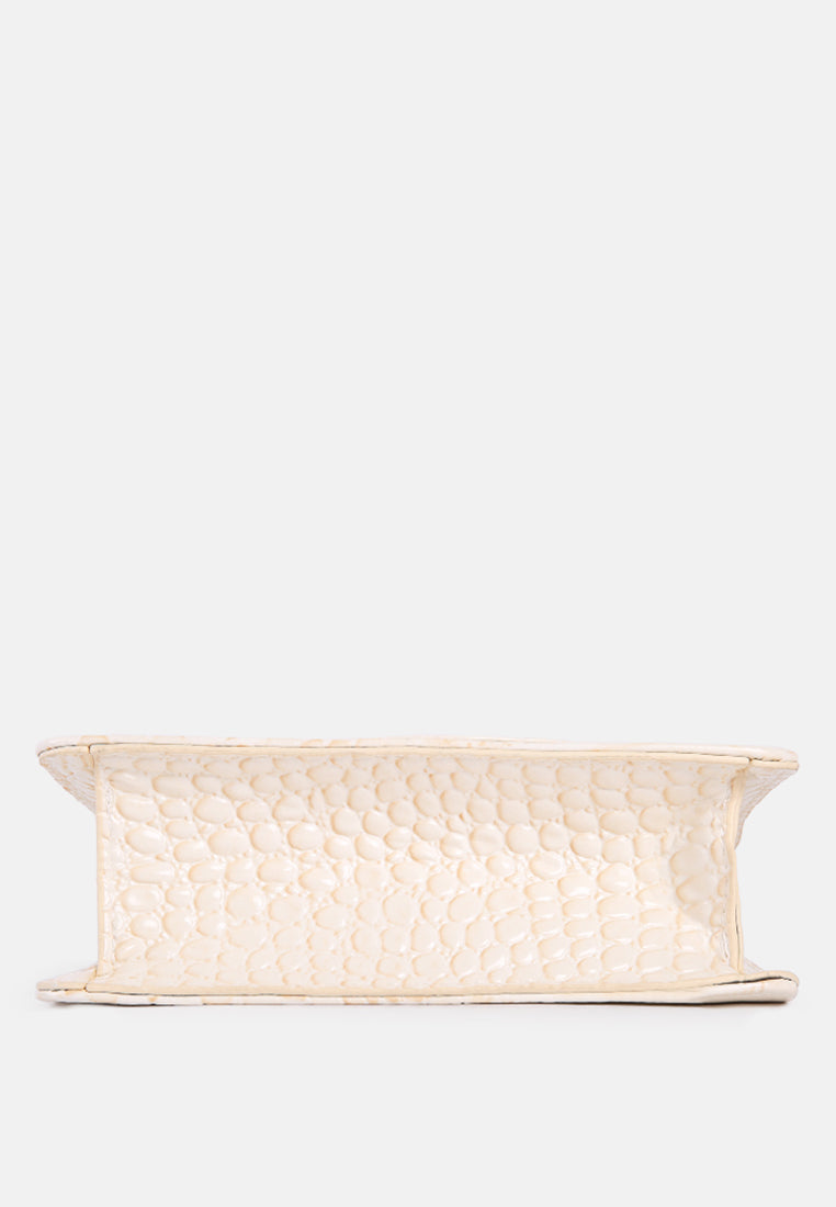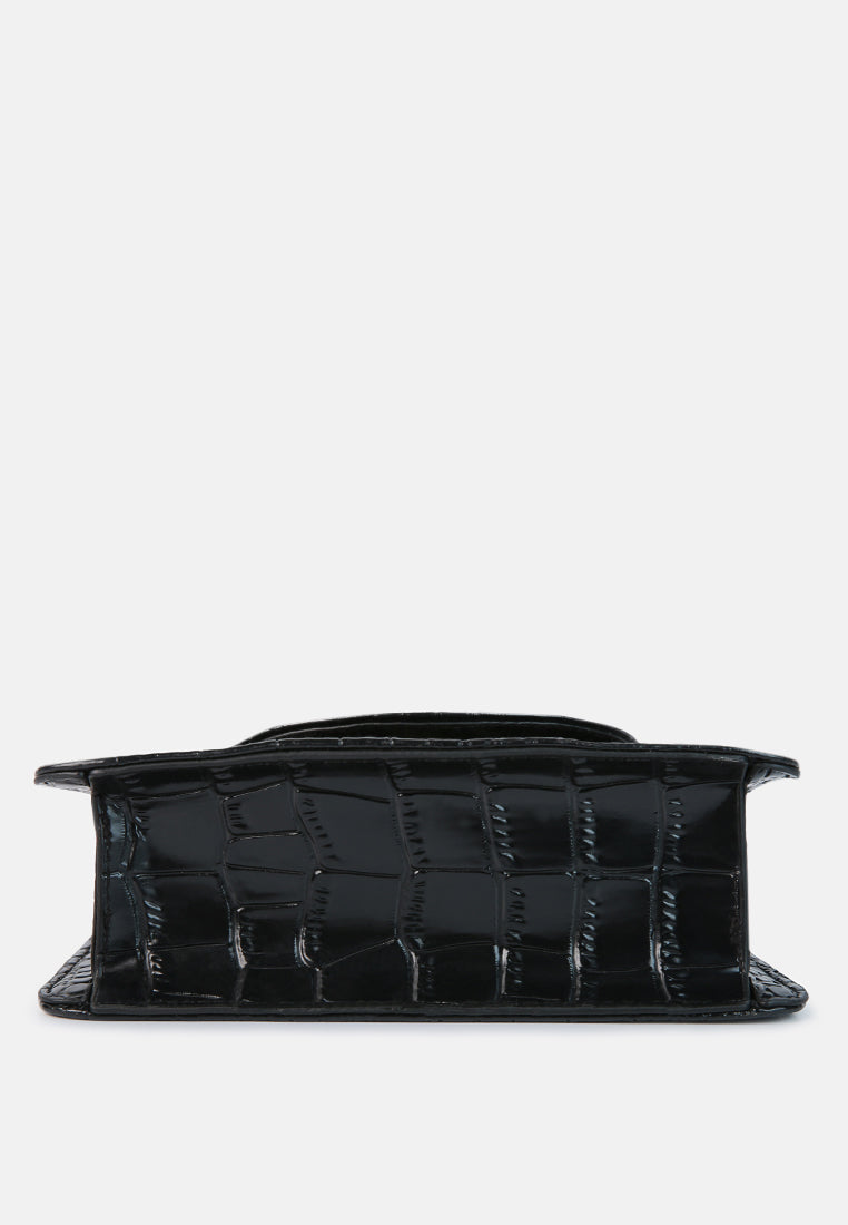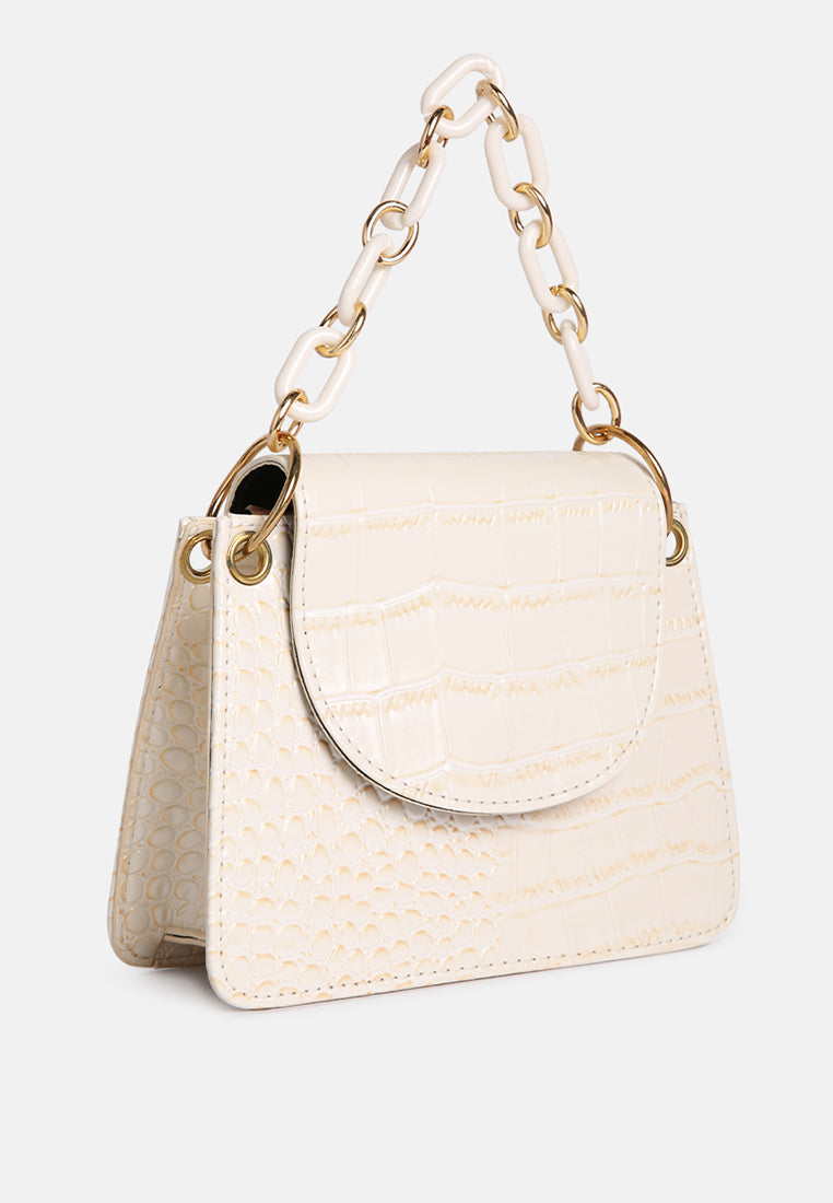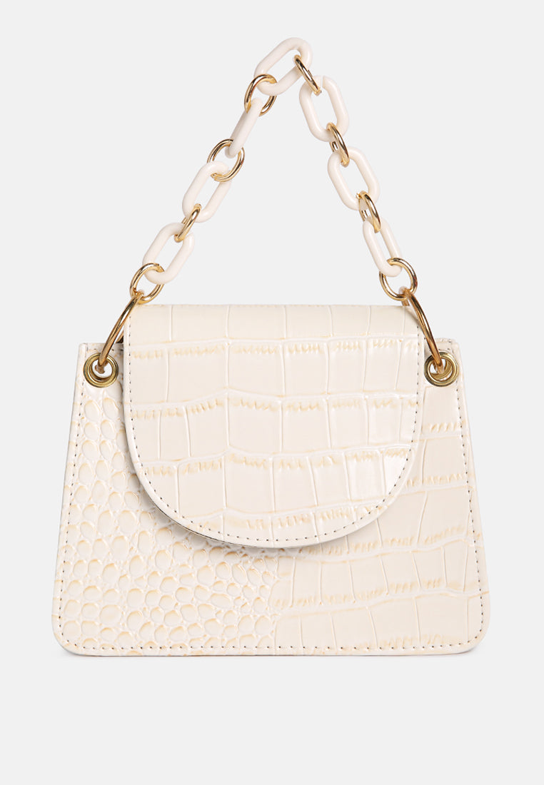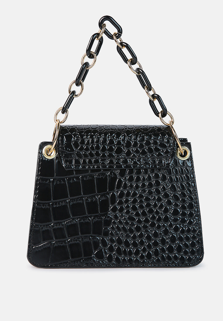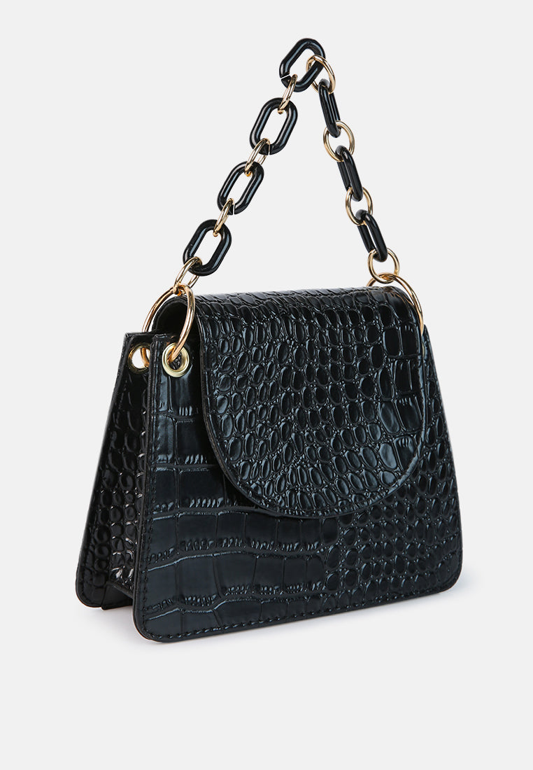 With Round Flap, this Envelope Sling Bag has an interesting Croc Textured Body and comes with a long detachable strap along with a stylish metal chain handle. It has a metallic button fastening.