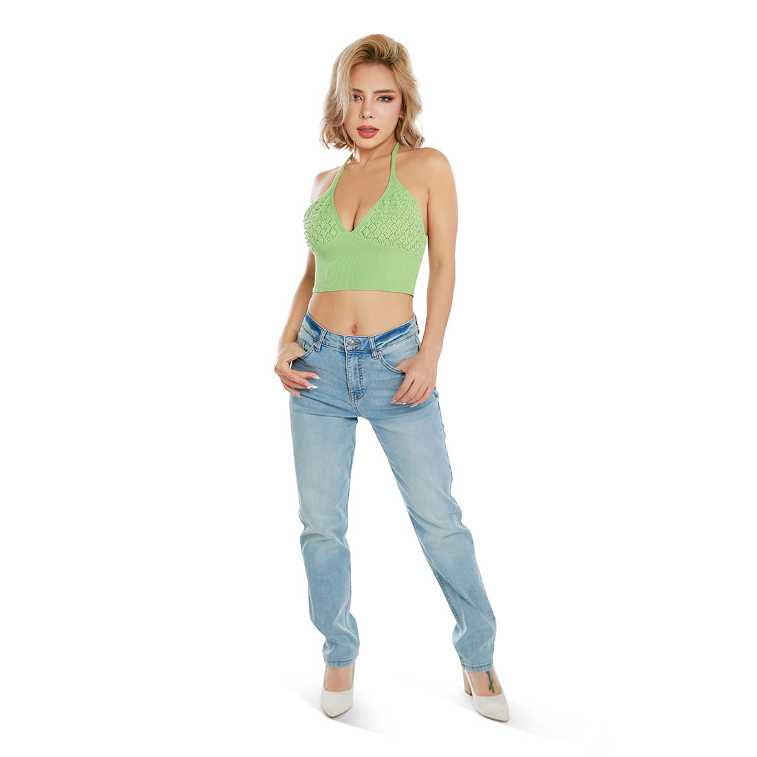 This halter neck crop top with a plunging neckline with pearls delicately placed on the bust is as cute as it can get! Designed with soft fabric for a comfortable fit, this corset-back bralette top is perfect for a night out or a date night.