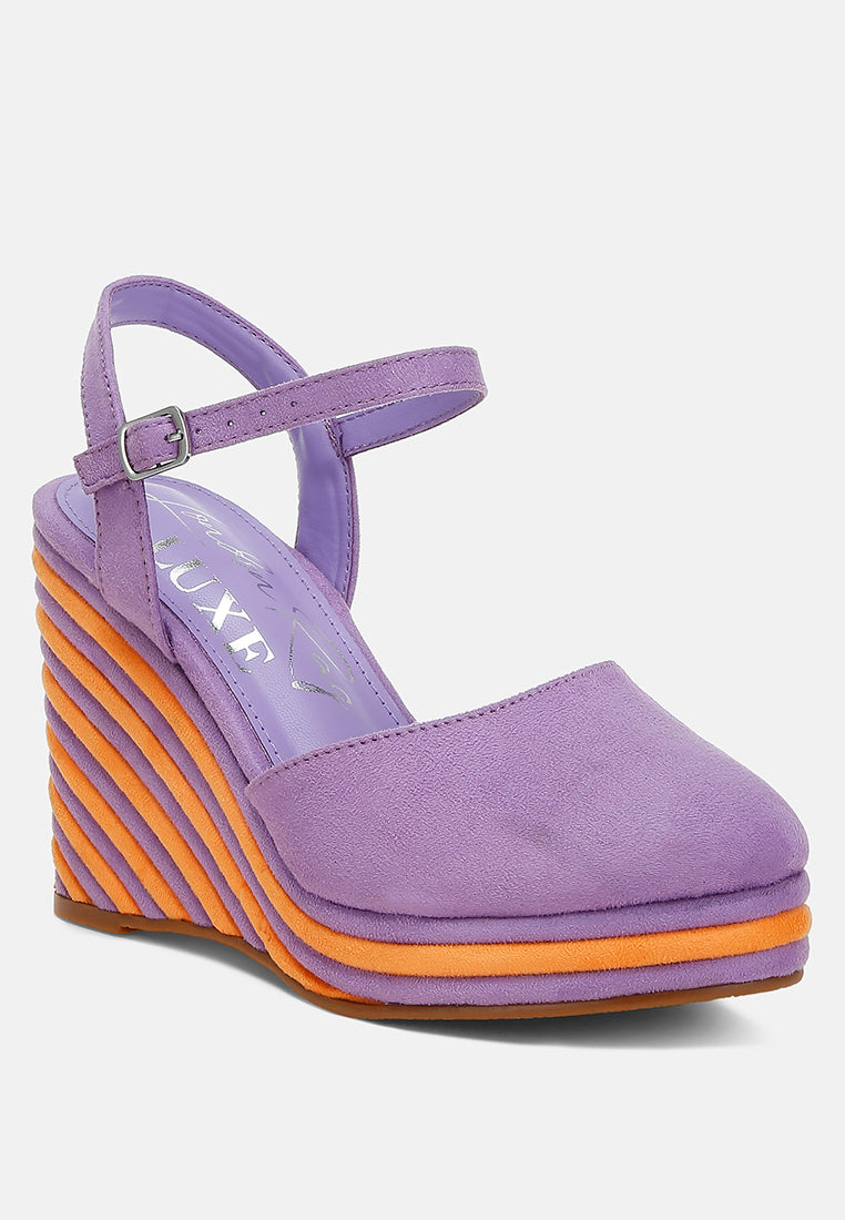 Ideal for pairing with a sundress or a wedding gown, these wedge sandals feature a microfiber upper and comfortable high wedge heels. The platform sole has a contrasting striped heel detail, and the pin buckle slingback strap offers a customizable fit. With a closed-round toe design and comfortable cushioned insoles, this pair is a must-have!