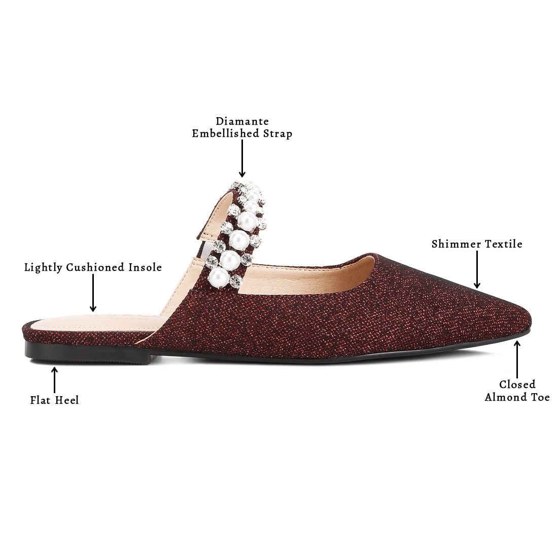 Flat mules which bring elegance and shine to your getup - the very sophisticated pointed mules with bejewelled straps. Has cushioned insole which helps absorb shock. Keeps safe with anti slip rubber outsole.