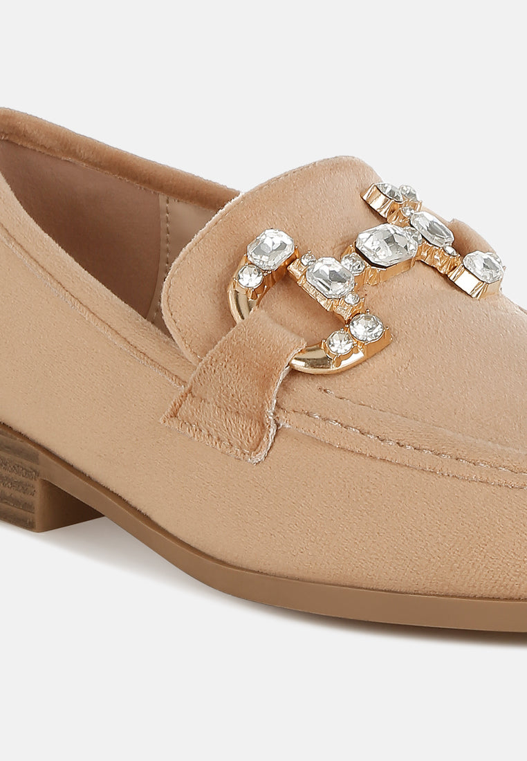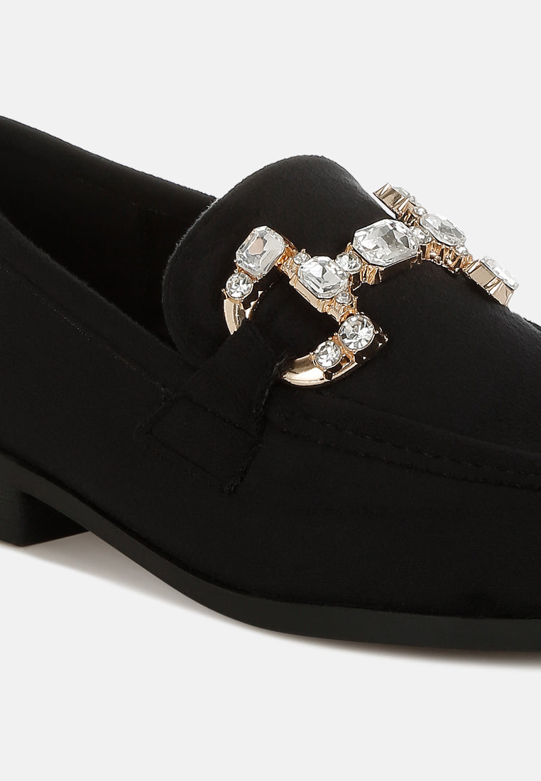 The flat loafers are comfortable with soft cushion insoles and have a dashing aesthetic with the elegant yet bold diamante embellished horsebit detail which accentuates the overall appeal of the microfiber loafers.