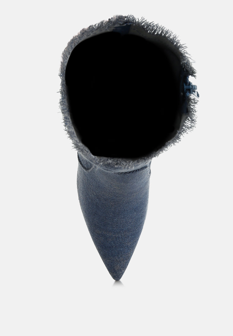 Introducing your new favorite distressed denim calf boots, straight from the '90s! With a convenient zipper closure, frayed raw-edge trim, and a classic stiletto heel, these boots are total head-turners. Featuring stylish paneling detail and a 3.5-inch heel, they're perfect for rocking a chic denim-on-denim look.