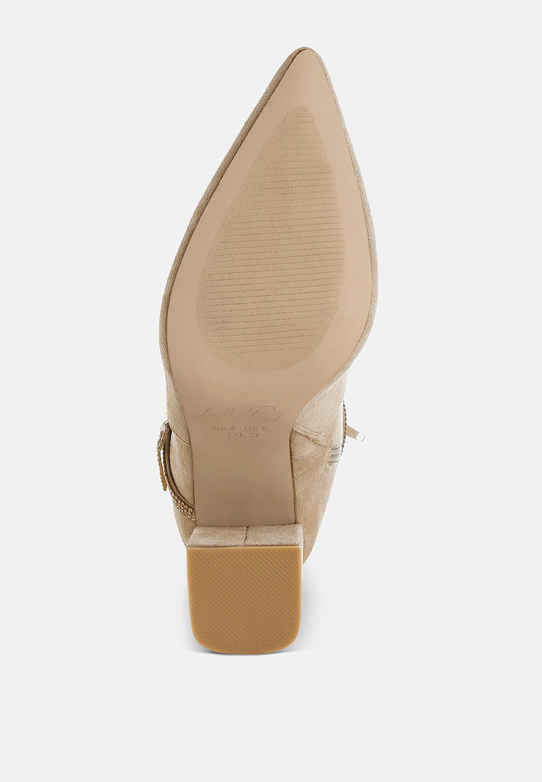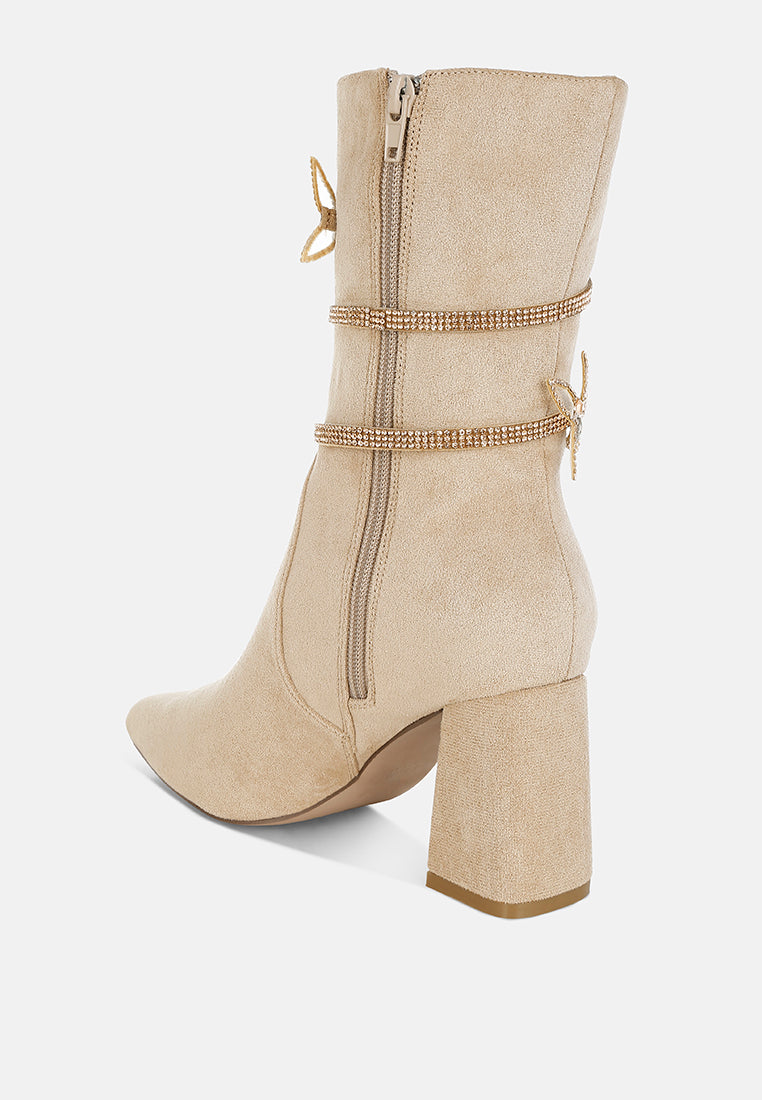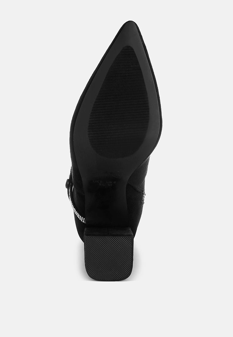Bringing glamour to new heights, these exquisite ankle boots are both elegant and dazzling, adorned with a stunning rhinestone brooch and wrap-around detail. With a pointed toe and 2.5-inch thick block heel, they offer a stunning look, while the side zipper ensures easy wear for a party-ready style.