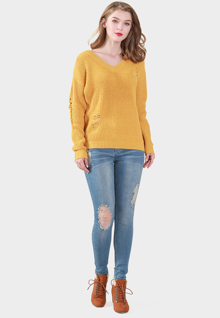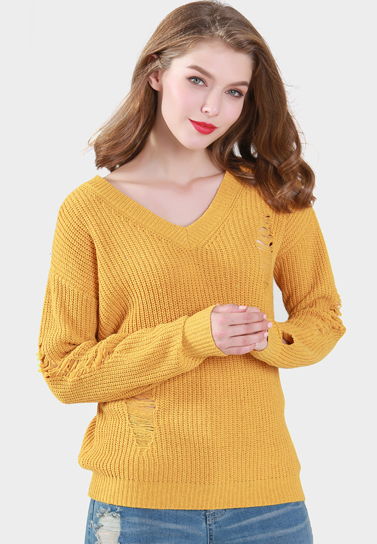 - Mustard Full Sleeve, V Neck, Ribbed and Ripped Knitted Sweater, Showcasing ribbed all over.