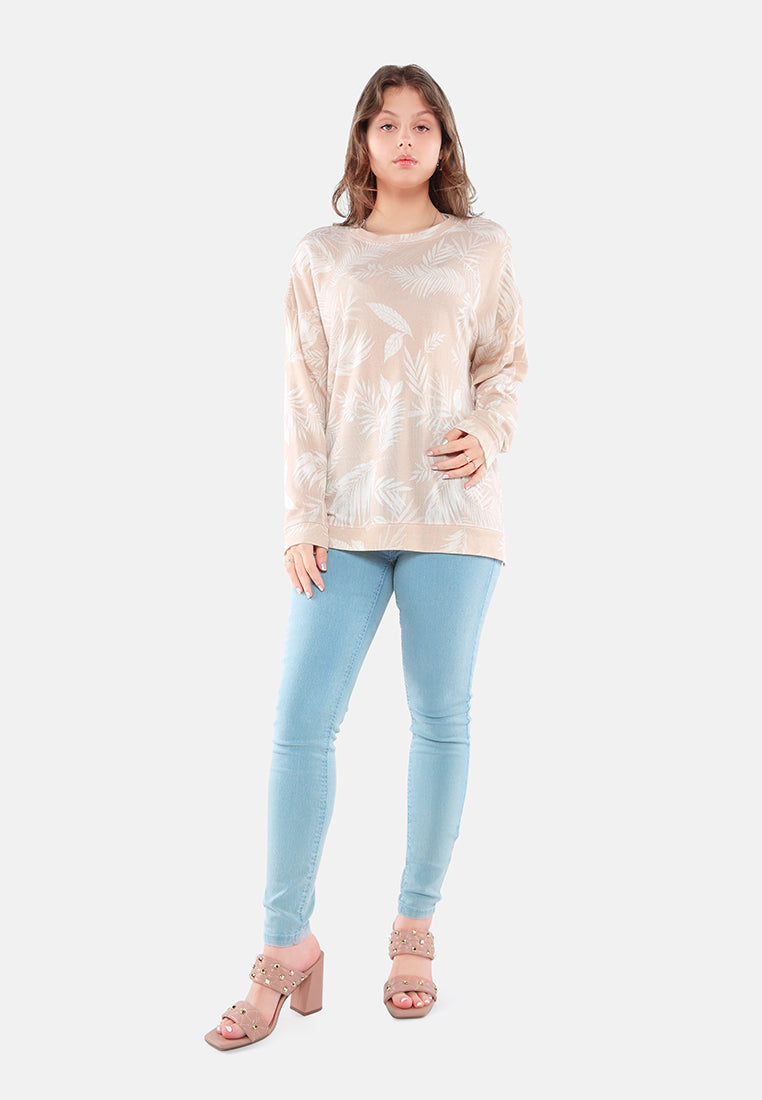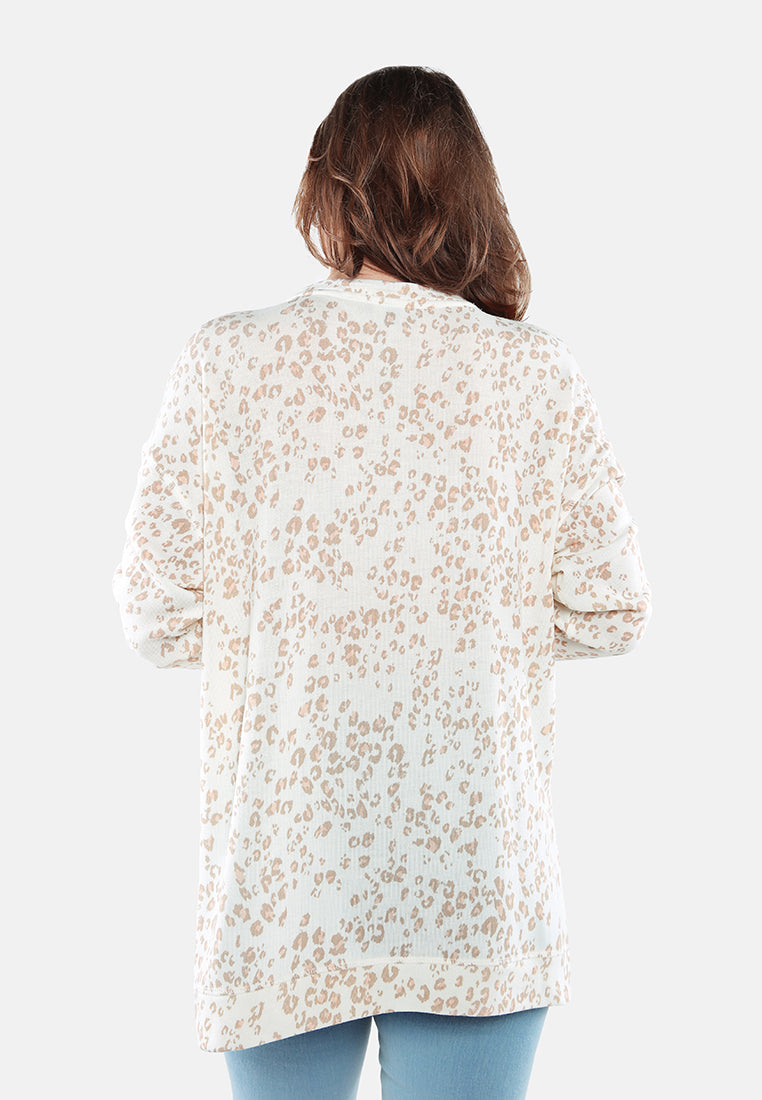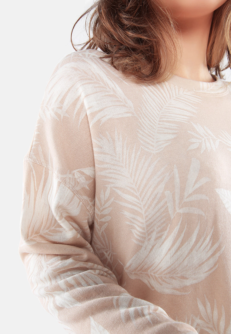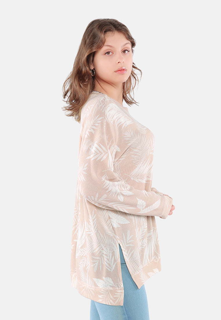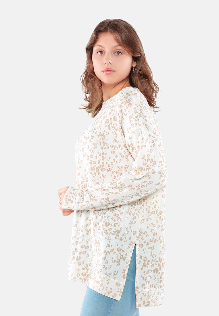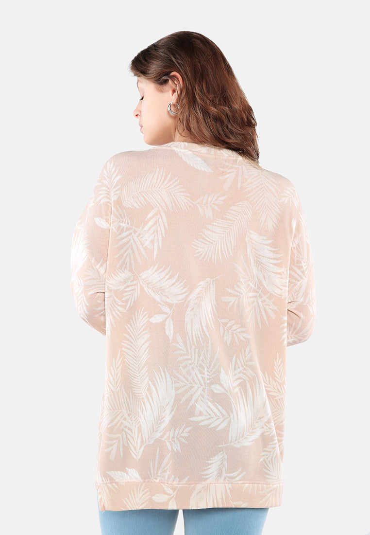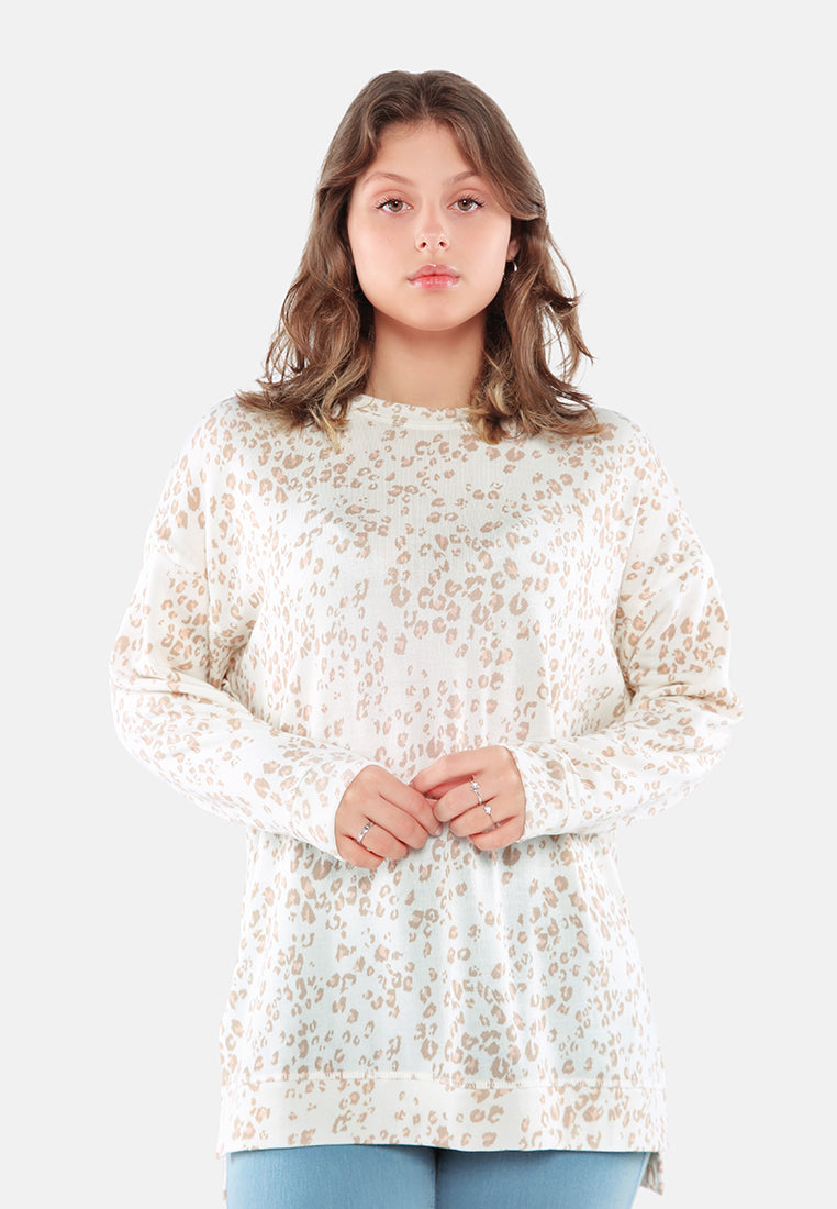 Crew neck printed oversized tunic top in fleece. The soft fabric top has rib-knit hem and drops shoulders with all-over printed detail.