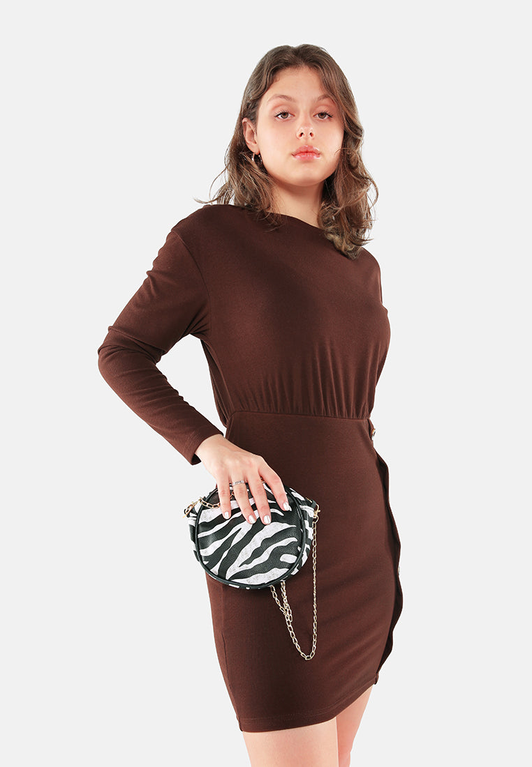 The mini Bodycon dress flatters the figure, and the full sleeves give it a sophisticated look. The button-down detail on the bottom side elevates the minimal dress to be lively and intriguing.