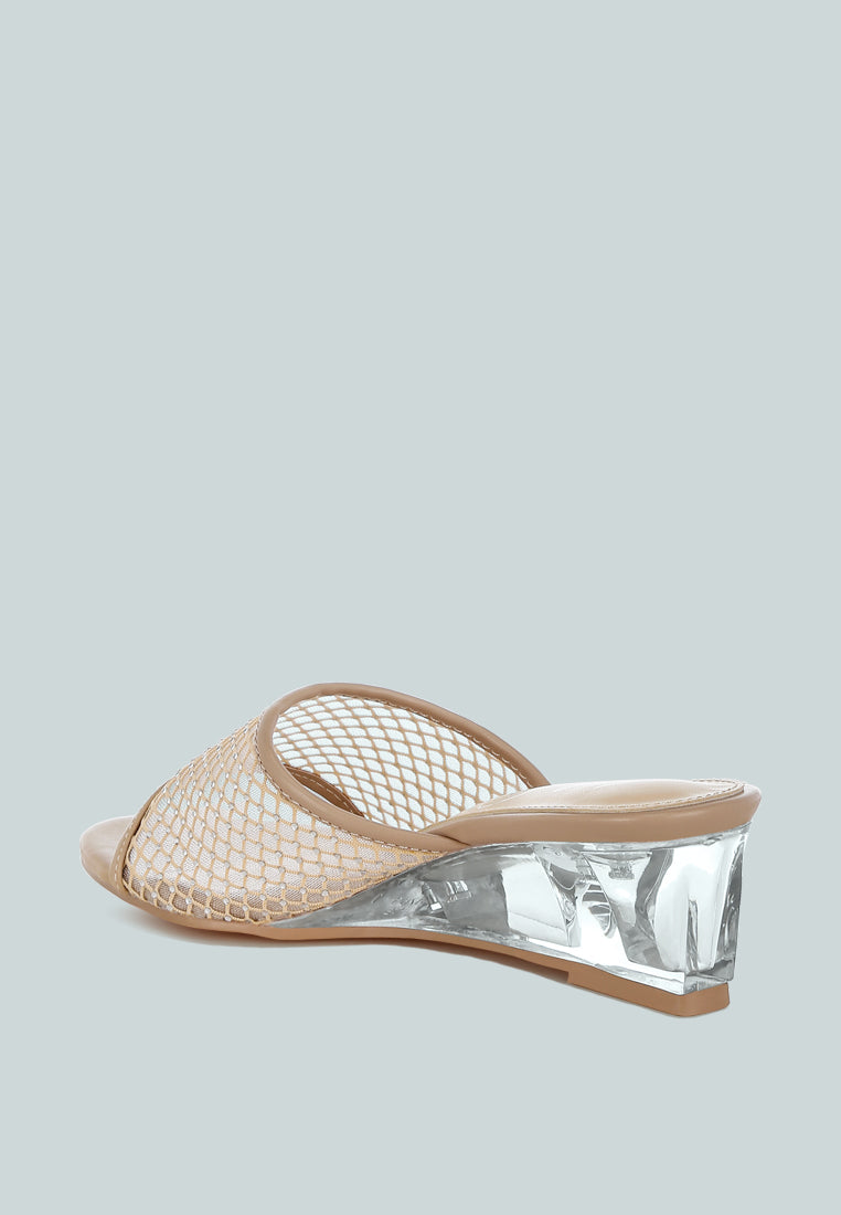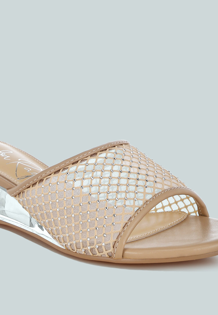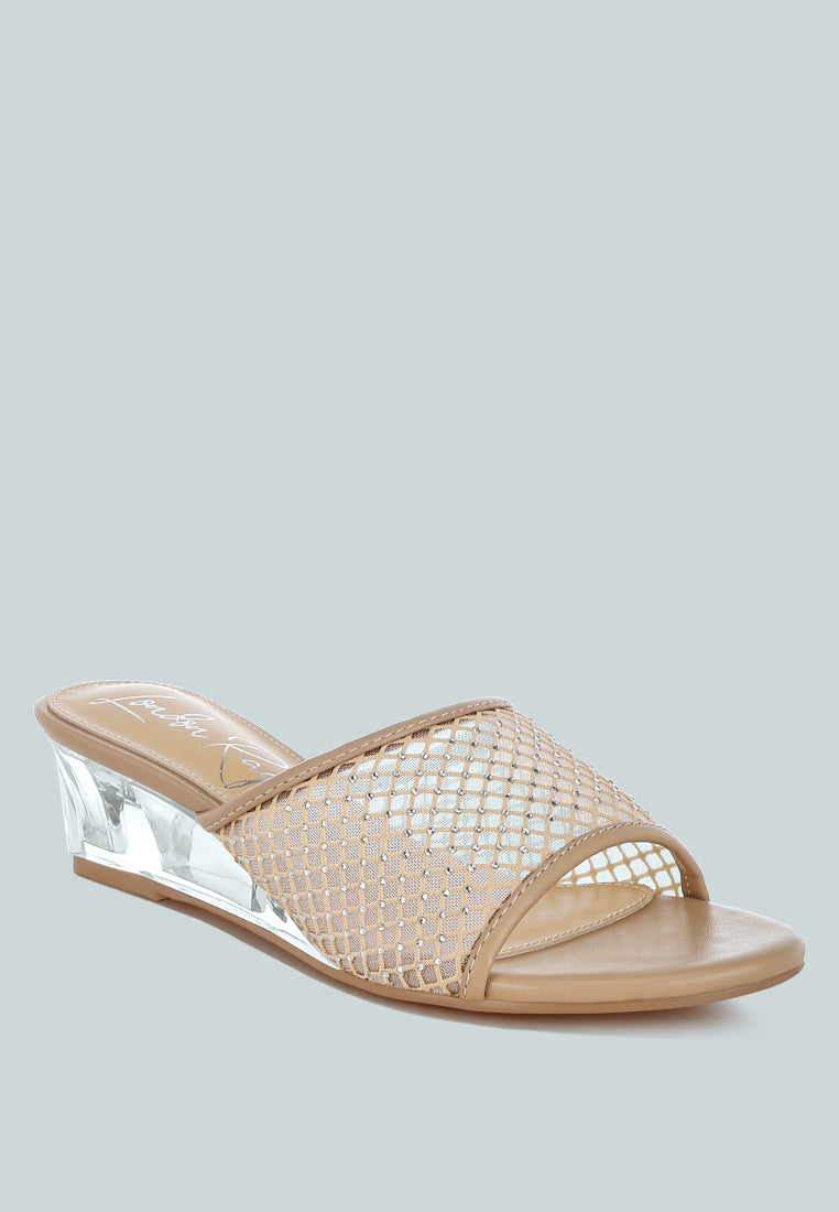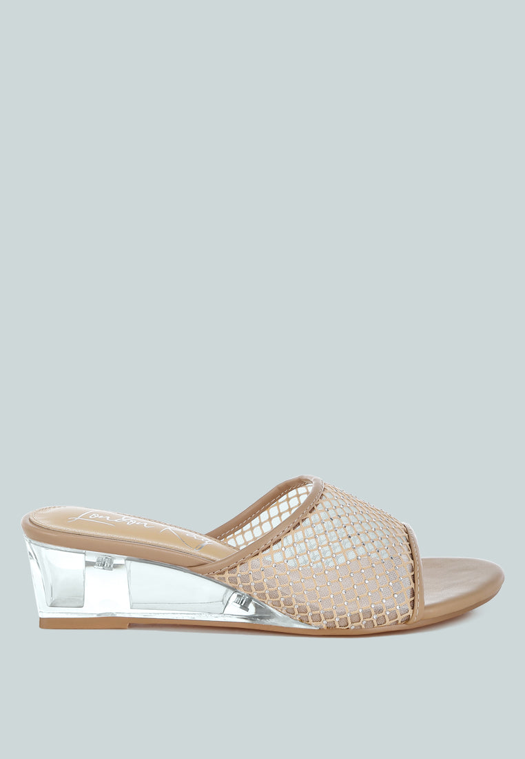 Give your footwear collection a stylish upgrade with these exquisite slip-on sandals. Designed with a rhinestone-studded mesh upper and clear wedge heels, they bring just the right amount of sparkle. Perfect for parties, weddings, or even pairing with your favorite casual looks.