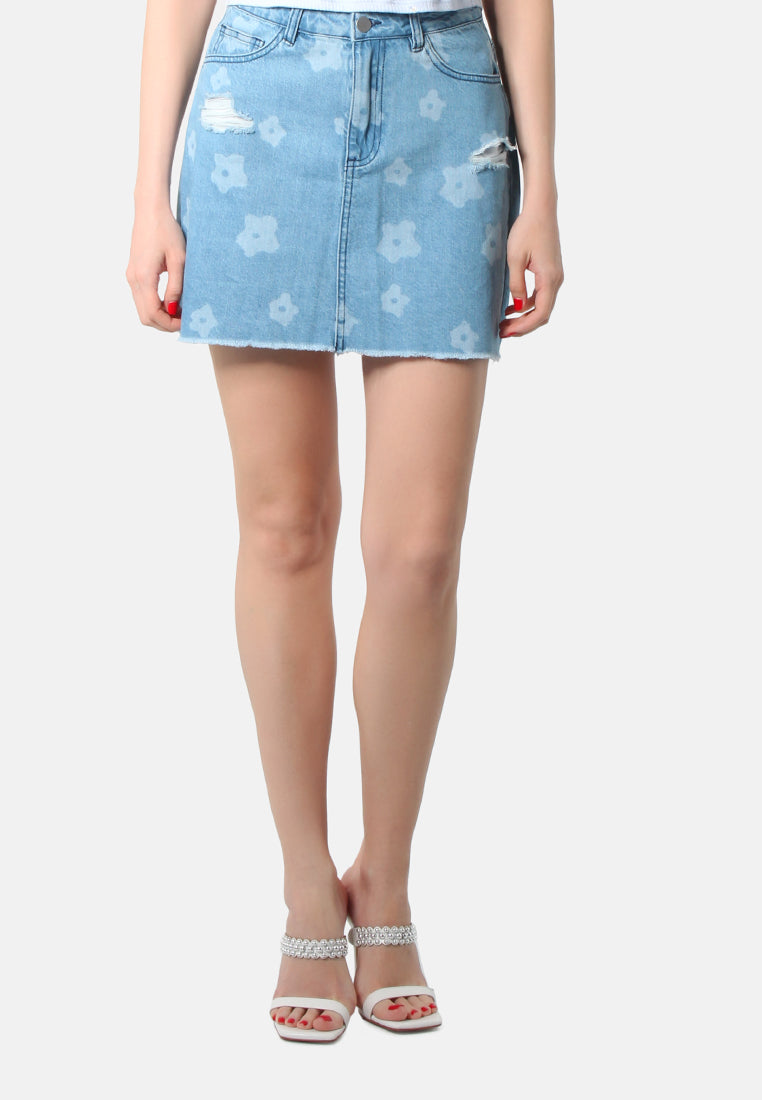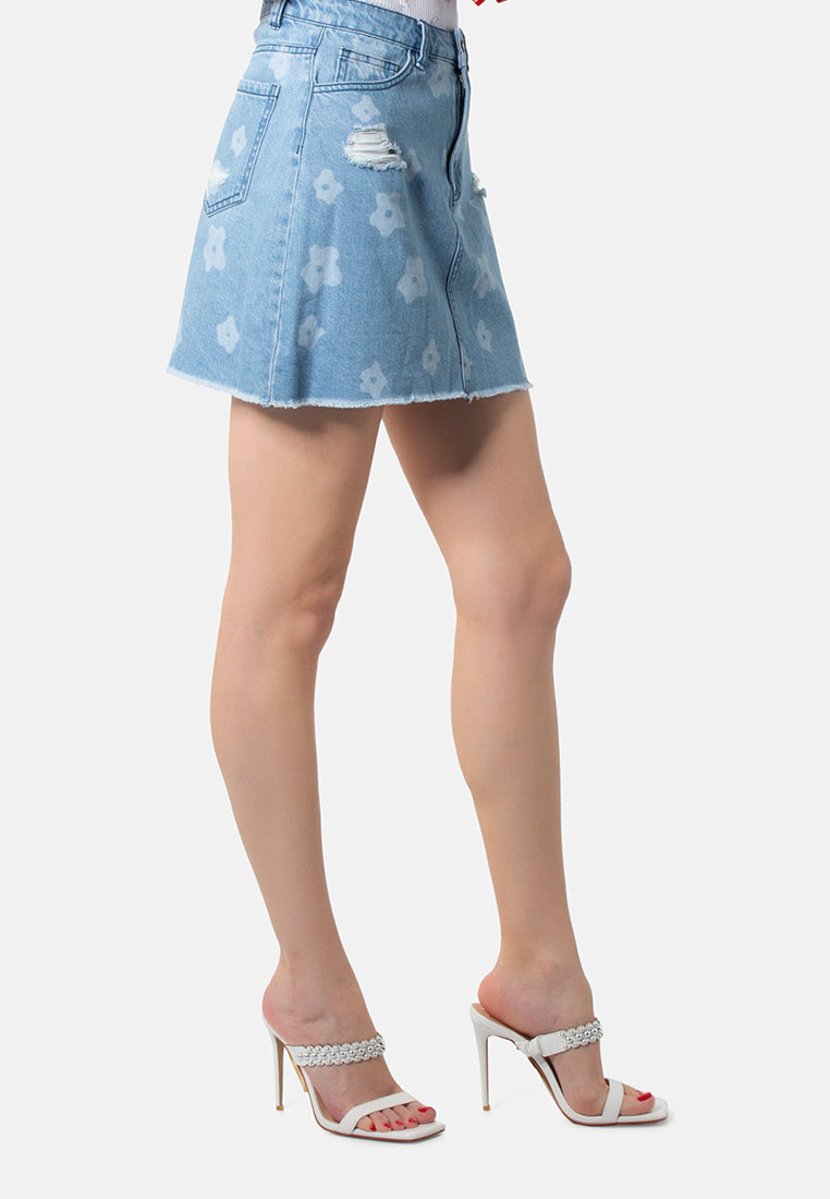 Women Blue Flower Print Ripped Jeans Mini Skirt