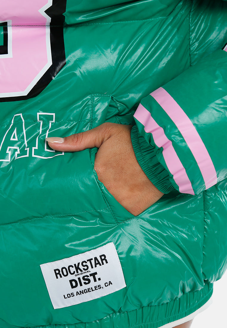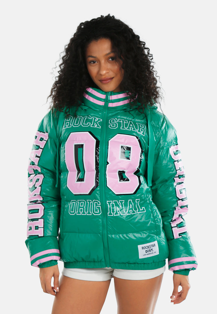 Stay warm and stylish with this puffer jacket featuring a high-neck collar and adjustable hood. Functional side pockets, a front zip closure, and bold logo detailing complete the look.