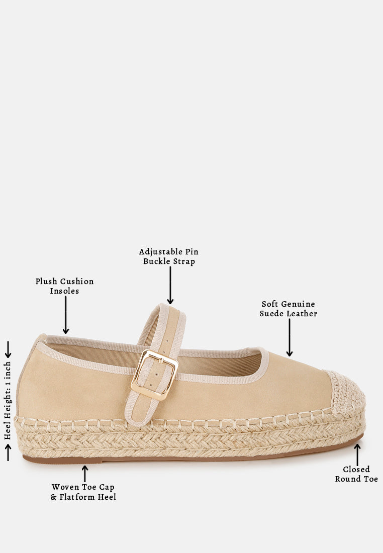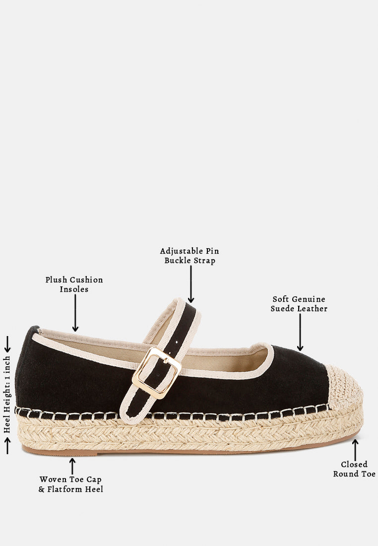 Crafted from genuine suede leather, these Mary Jane espadrilles redefine style. Featuring a woven toe cap and heel, they balance elegance and comfort. The pin buckle strap ensures a secure fit, making them ideal for all-day wear. Perfectly paired with a summery top and jeans or an elegant maxi dress, these exquisite espadrilles are your best bet.