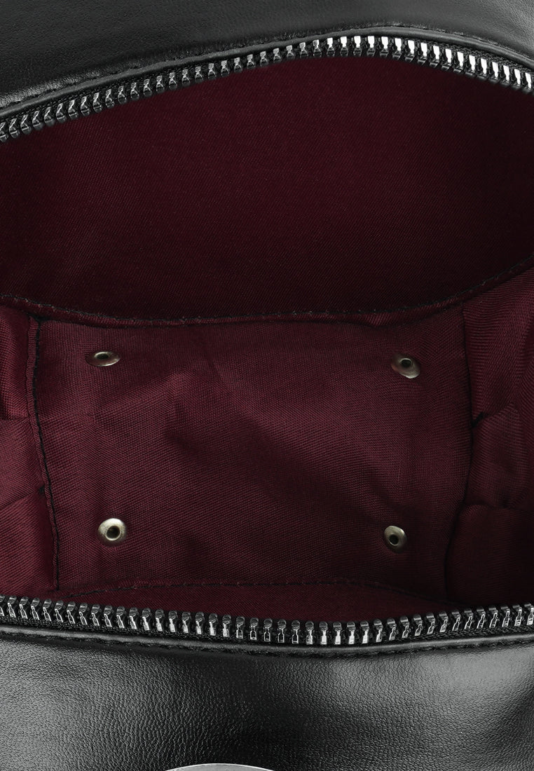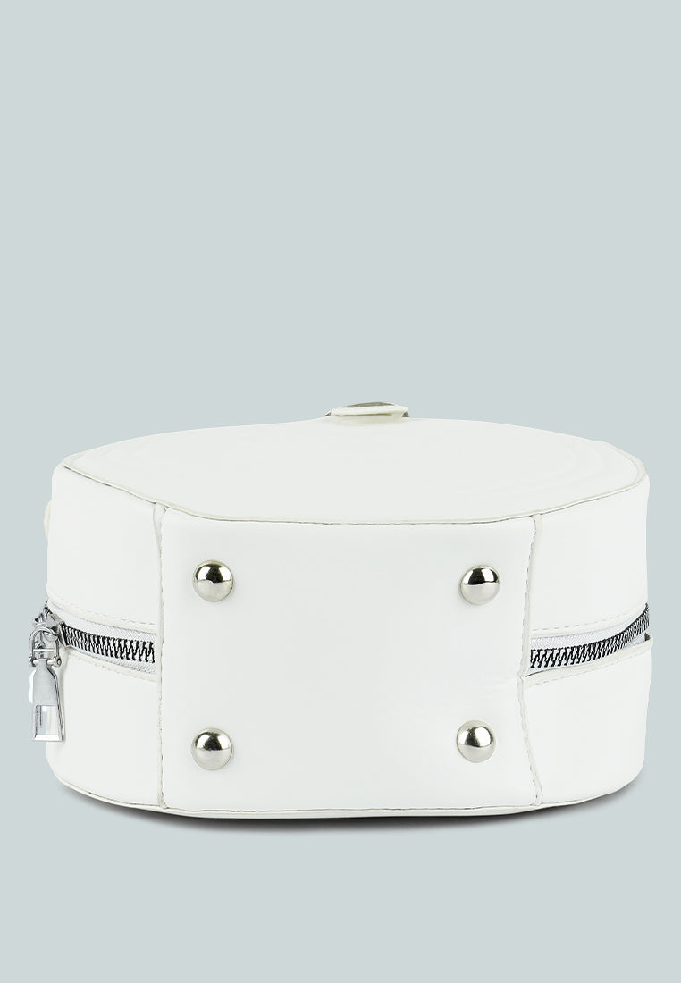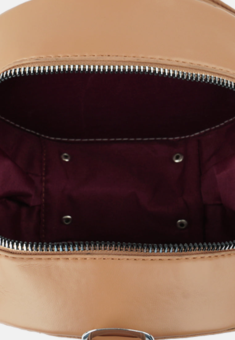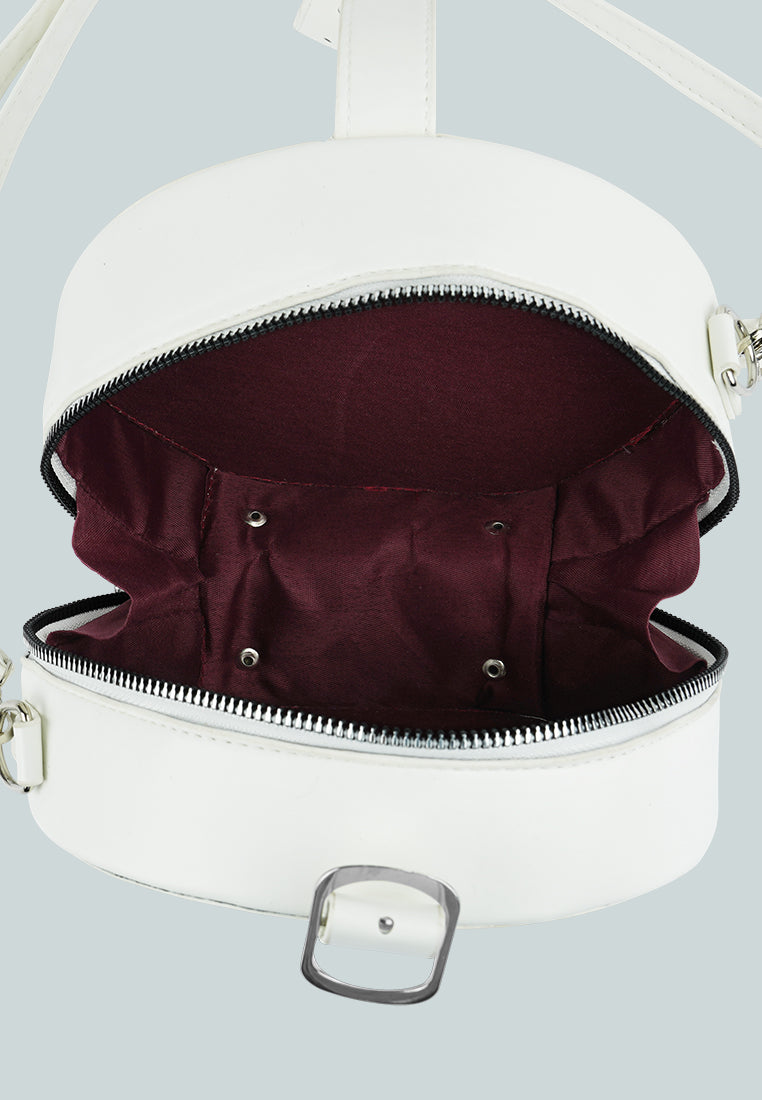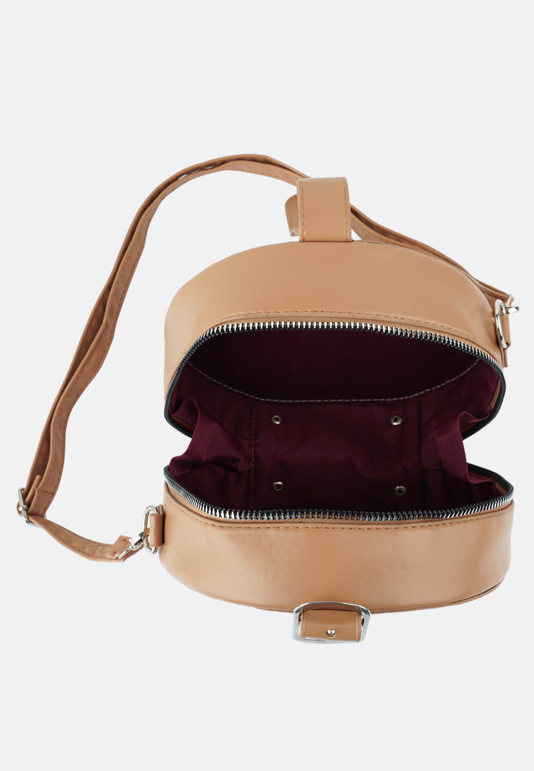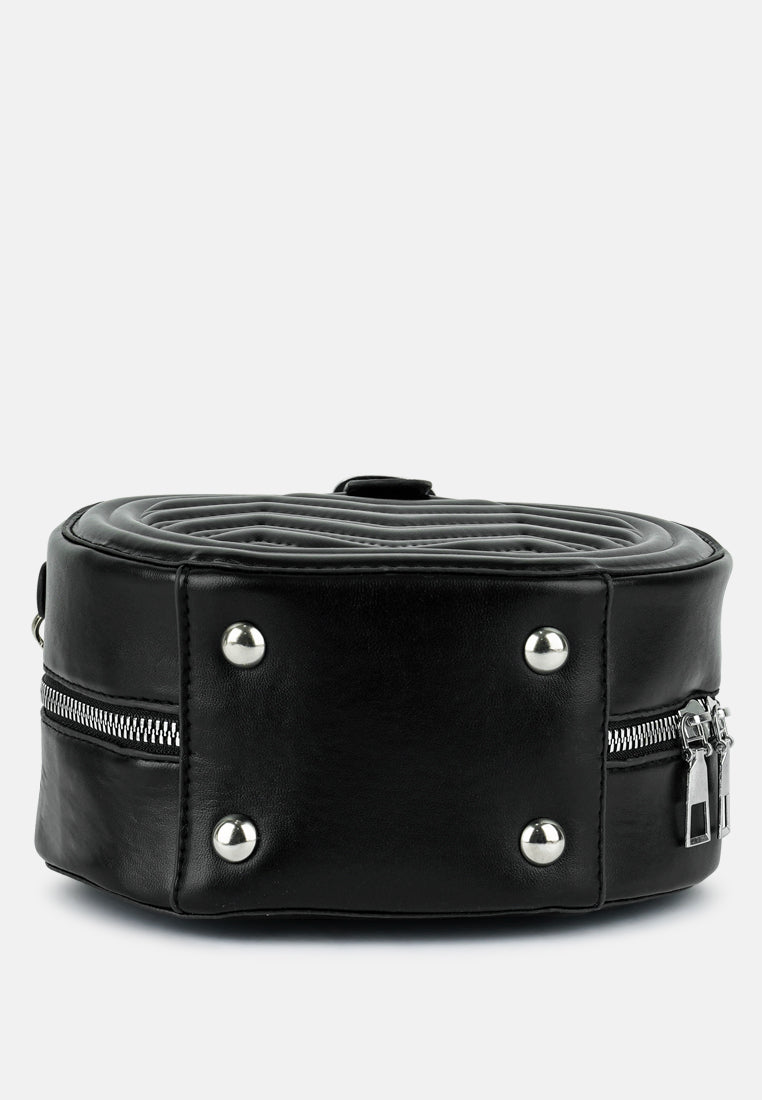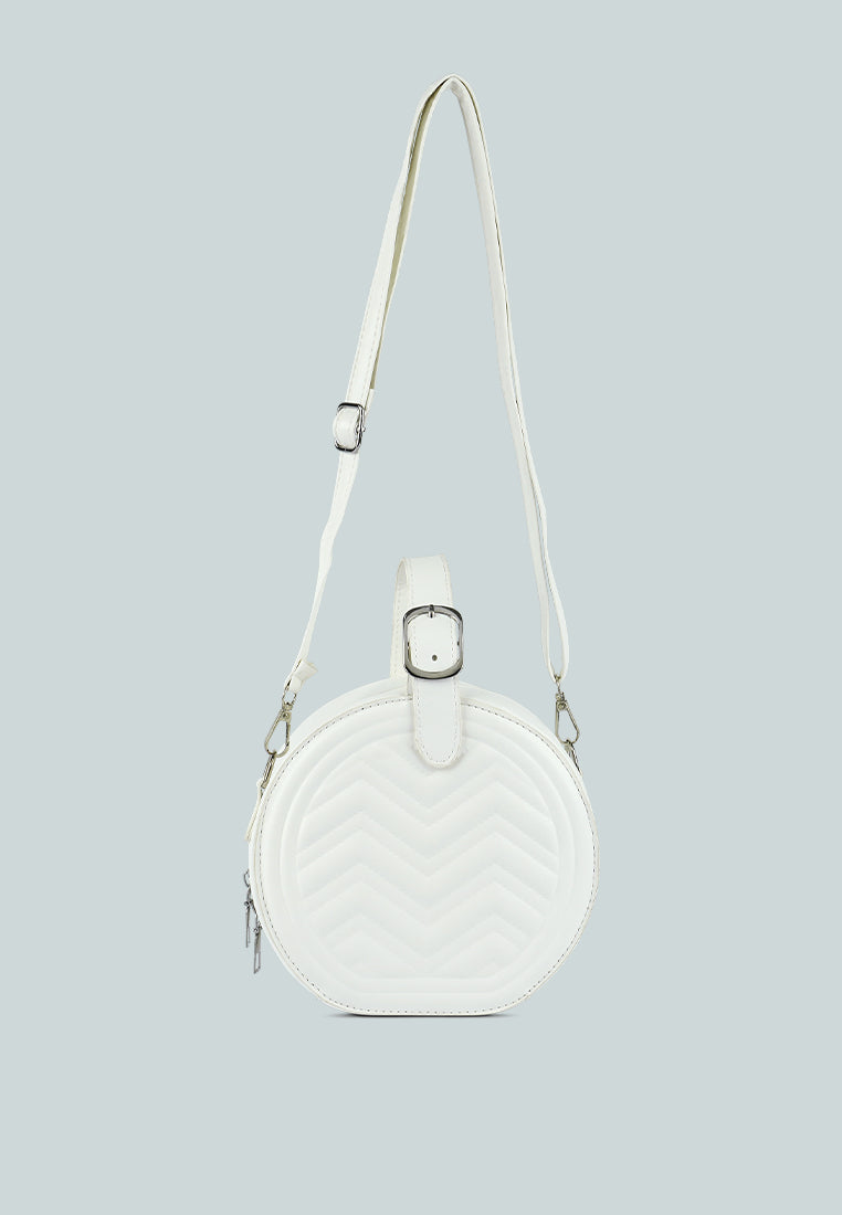Interesting styling can be done with this trendy quilted sling bag. The round-shaped bag has a metallic zipper opening and enough room to pack your basics when you are all set to move!