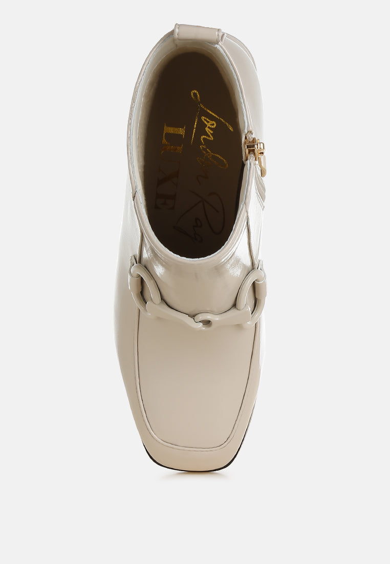 The shiny patent faux leather boots are definitely one of a kind with the textured block heel and the monochromatic horsebit embellishment which subtly yet distinctively make a stylish statement. The trendy ankle boots are a versatile style and comfortable with the block heels and soft cushion insoles.