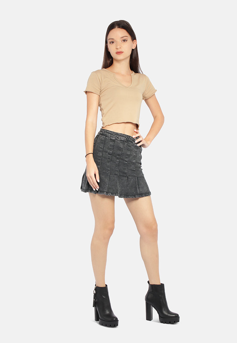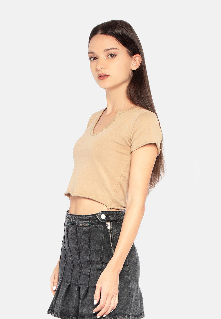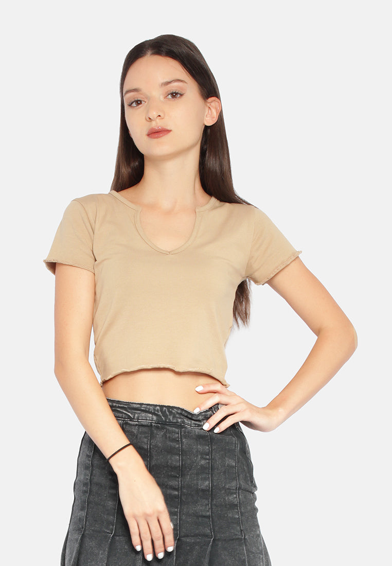 The short top in half sleeves with V neckline is basic casual style. It has rolled hem detailing.